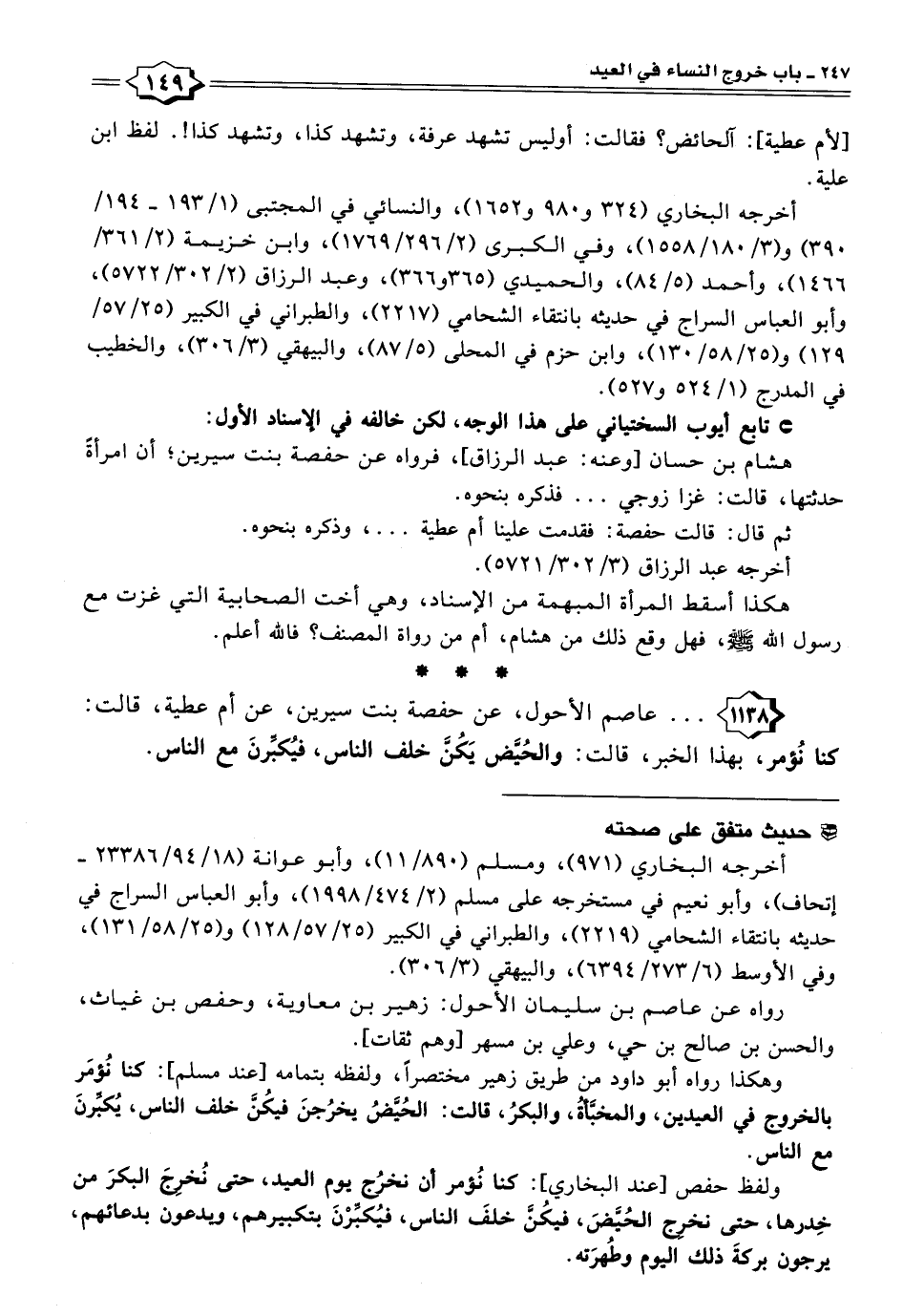 ١١٣٨ - . . . عاصم الأحول، عن حفصة بنت سيرين، عن أم عطية، قالت: كنا نُؤمر، بهذا الخبر، قالت: والحُيَّض يَكُنَّ خلف الناس، فيُكبِّرنَ مع الناس.