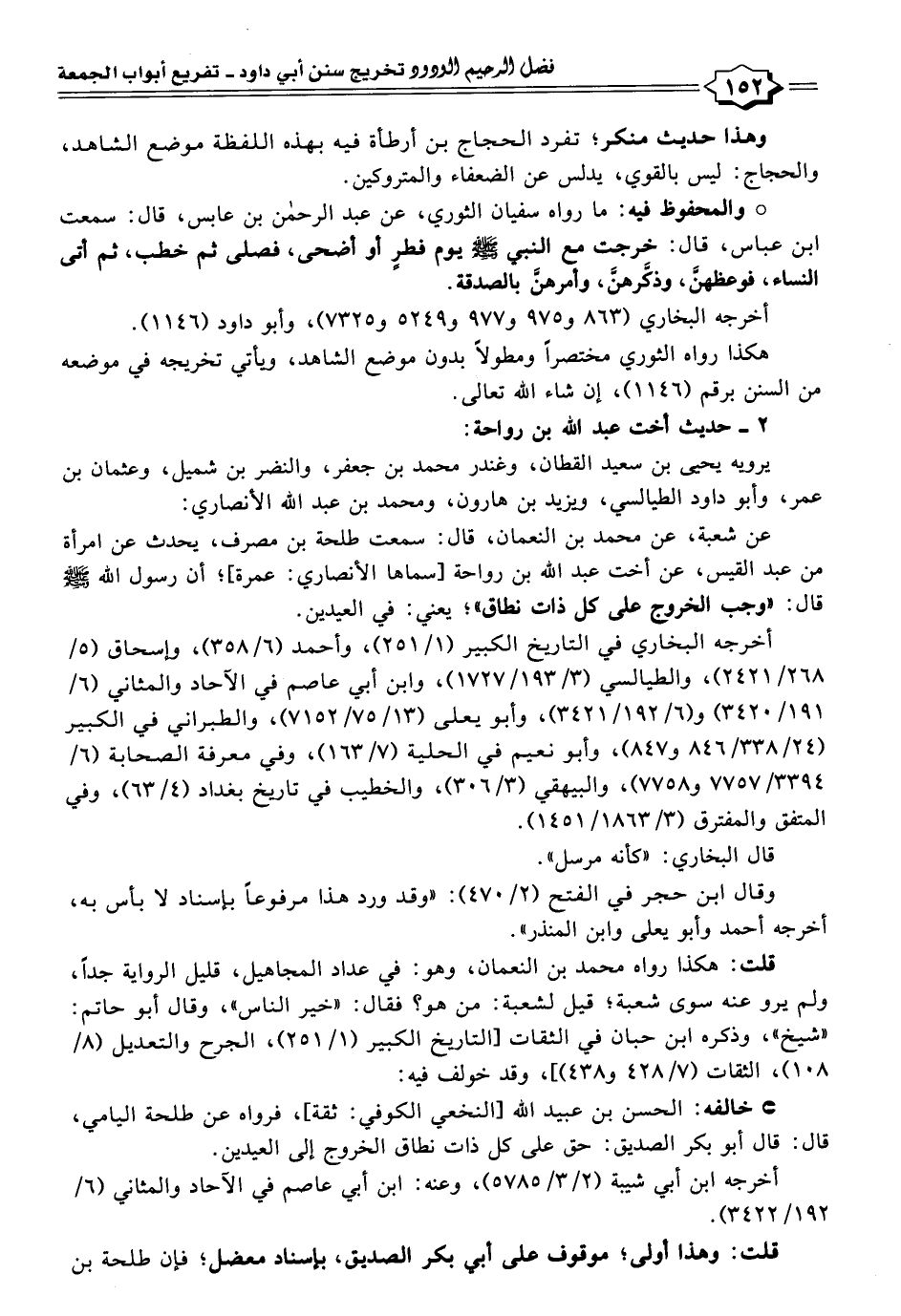 عن شعبة، عن محمد بن النعمان، قال: سمعت طلحة بن مصرف، يحدث عن امرأة من عبد القيس، عن أخت عبد اللَّه بن رواحة [سماها الأنصاري: عمرة]؛ أن رسول اللَّه -صلى اللَّه عليه وسلم- قال: "وجب الخروج على كل ذات نطاق"؛ يعني: في العيدين.