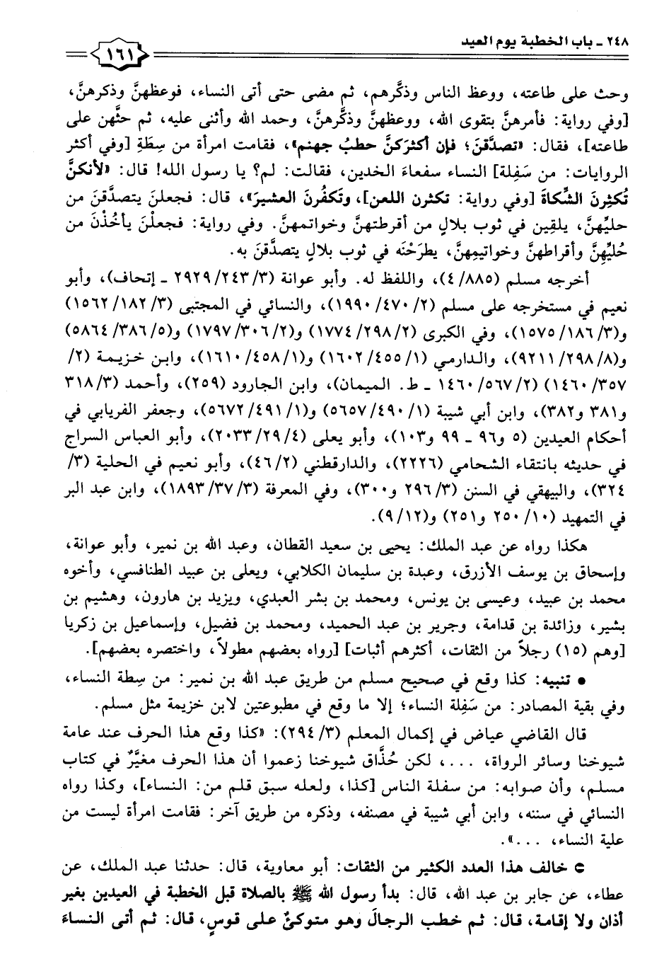 * خالف هذا العدد الكثير من الثقات: أبو معاوية، قال: حدثنا عبد الملك، عن عطاء، عن جابر بن عبد اللَّه، قال: بدأ رسول اللَّه -صلى اللَّه عليه وسلم- بالصلاة قبل الخطبة في العيدين بغير أذان ولا اقامة، قال: ثم خطب الرجالَ وهو متوكئٌ على قوسٍ، قال: ثم أتى النساءَ