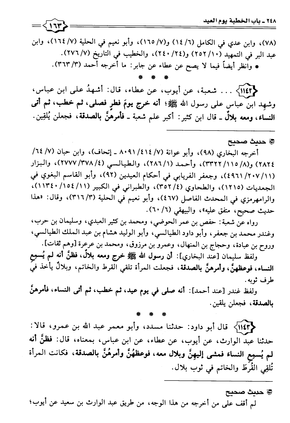 ١١٤٢ - . . . شعبة، عن أيوب، عن عطاء، قال: أشهدُ على ابن عباس، وشهِد ابن عباس على رسول اللَّه -صلى اللَّه عليه وسلم-؛ أنه خرج يومَ فطرٍ فصلى، ثم خطب، ثم أنى النساءَ، ومعه بلالٌ -قال ابن كثير: أكبر علم شعبة- فأمرهنَّ بالصدقة، فجعلن يُلقِين.