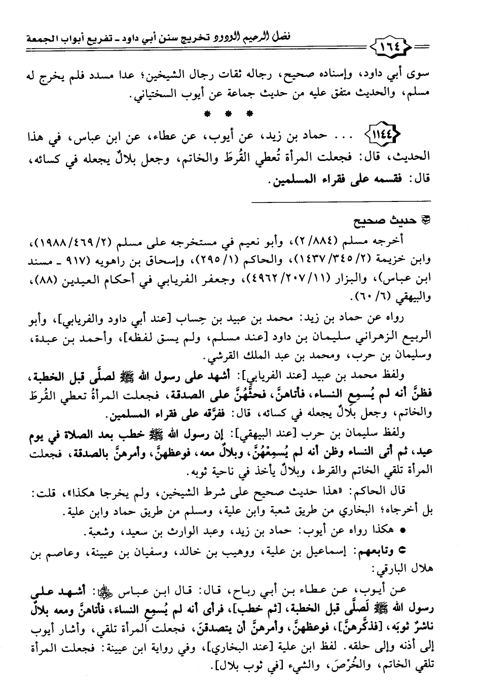 ١١٤٤ - . . . حماد بن زيد، عن أيوب، عن عطاء، عن ابن عباس، في هذا الحديث، قال: فجعلت المرأة تُعطي القُرطَ والخاتم، وجعل بلالٌ يجعله في كسائه، قال: فقسمه على فقراء المسلمين.