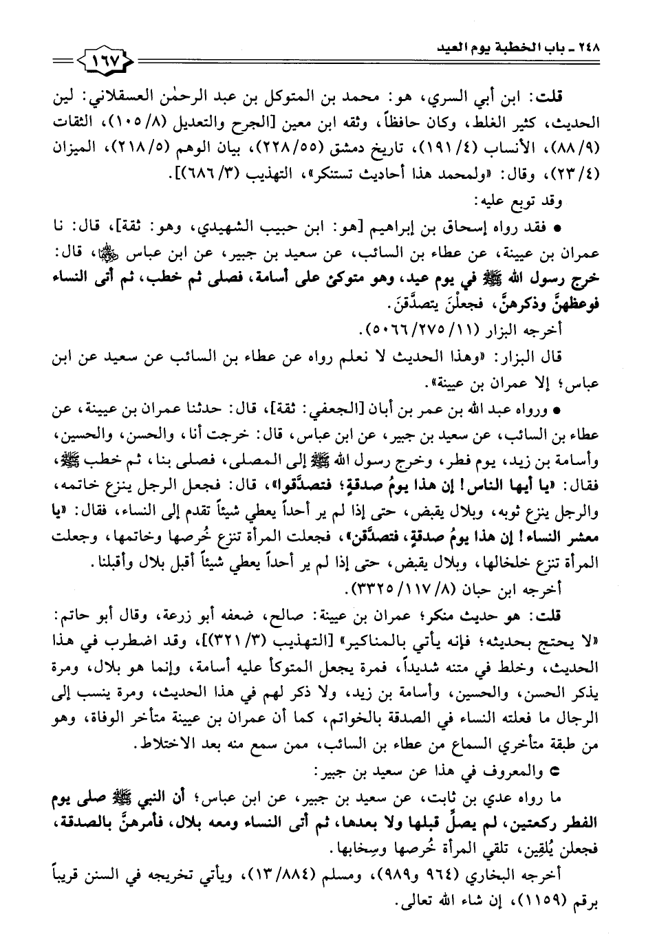 • فقد رواه إسحاق بن إبراهيم [هو: ابن حبيب الشهيدي، وهو: ثقة]، قال: نا عمران بن عيينة، عن عطاء بن السائب، عن سعيد بن جبير، عن ابن عباس -رضي اللَّه عنهما-، قال: خرج رسول اللَّه -صلى اللَّه عليه وسلم- في يوم عيد، وهو متوكئ على أسامة، فصلى ثم خطب، ثم أتى النساء فوعظهنَّ وذكرهنَّ، فجعلْنَ يتصدَّقنَ.