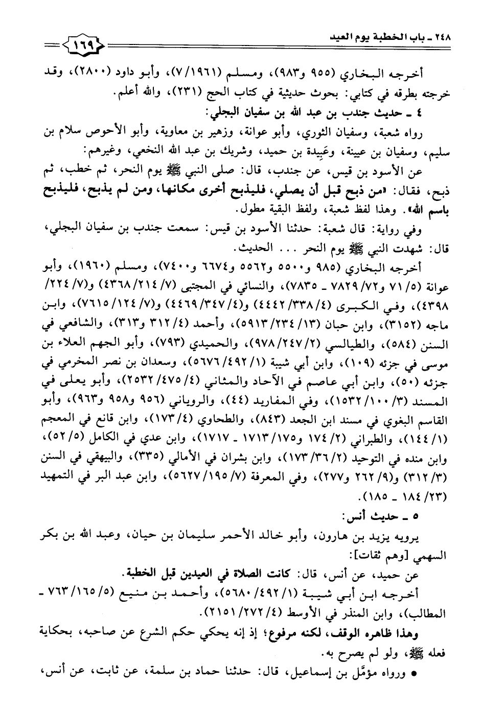 عن الأسود بن قيس، عن جندب، قال: صلى النبي -صلى اللَّه عليه وسلم- يوم النحر، ثم خطب، ثم ذبح، فقال: "من ذبح قبل أن يصلي، فليذبح أخرى مكانها، ومن لم يذبح، فليذبح باسم اللَّه". وهذا لفظ شعبة، ولفظ البقية مطول.