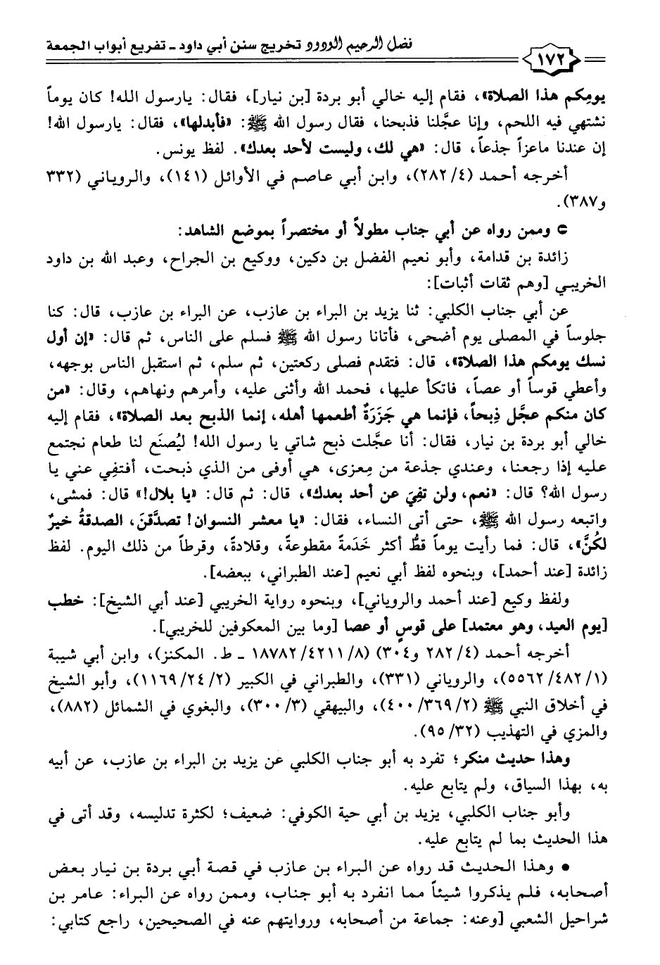 عن أبي جناب الكلبي: ثنا يزيد بن البراء بن عازب، عن البراء بن عازب، قال: كنا جلوسًا في المصلى يوم أضحى، فأتانا رسول اللَّه -صلى اللَّه عليه وسلم- فسلم على الناس، ثم قال: "إن أول نسك يومكم هذا الصلاة"، قال: فتقدم فصلى ركعتين، ثم سلم، ثم استقبل الناس بوجهه، وأعطي قوسًا أو عصًا، فاتكأ عليها، فحمد اللَّه وأثنى عليه، وأمرهم ونهاهم، وقال: "من كان منكم عجَّل ذِبحًا، فإنما هي جَزَرَةٌ أطعمها أهله، إنما الذبح بعد الصلاة"، فقام إليه خالي أبو بردة بن نيار، فقال: أنا عجَّلت ذبح شاتي يا رسول اللَّه! ليُصنَع لنا طعام نجتمع عليه إذا رجعنا، وعندي جذعة من مِعزى، هي أوفى من الذي ذبحت، أفتفِي عني يا رسول اللَّه؟ قال: "نعم، ولن تفِيَ عن أحد بعدك"، قال: ثم قال: "يا بلال! " قال: فمشى، واتبعه رسول اللَّه -صلى اللَّه عليه وسلم-، حتى أتى النساء، فقال: "يا معشر النسوان! تصدَّقنَ، الصدقةُ خيرٌ لكُنَّ"، قال: فما رأيت يومًا قطُّ أكثر خَدَمةً مقطوعةً، وقلادةً، وقرطًا من ذلك اليوم. لفظ زائدة [عند أحمد]، وبنحوه لفظ أبي نعيم [عند الطبراني، ببعضه].