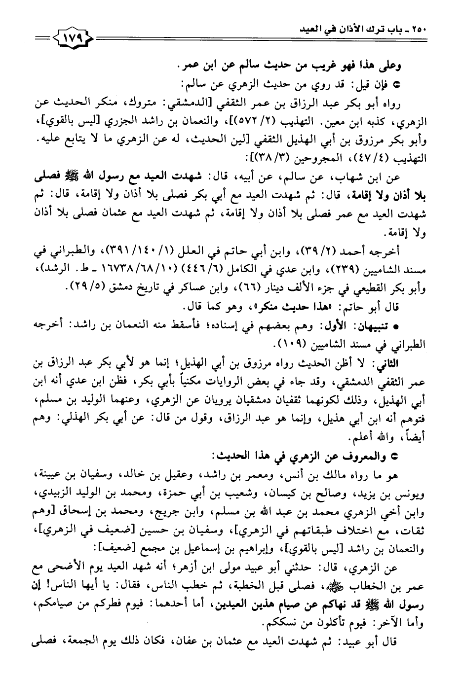 عن ابن شهاب، عن سالم، عن أبيه، قال: شهدت العيد مع رسول اللَّه -صلى اللَّه عليه وسلم- فصلى بلا أذان ولا إقامة، قال: ثم شهدت العيد مع أبي بكر فصلى بلا أذان ولا إقامة، قال: ثم شهدت العيد مع عمر فصلى بلا أذان ولا إقامة، ثم شهدت العيد مع عثمان فصلى بلا أذان ولا إقامة.