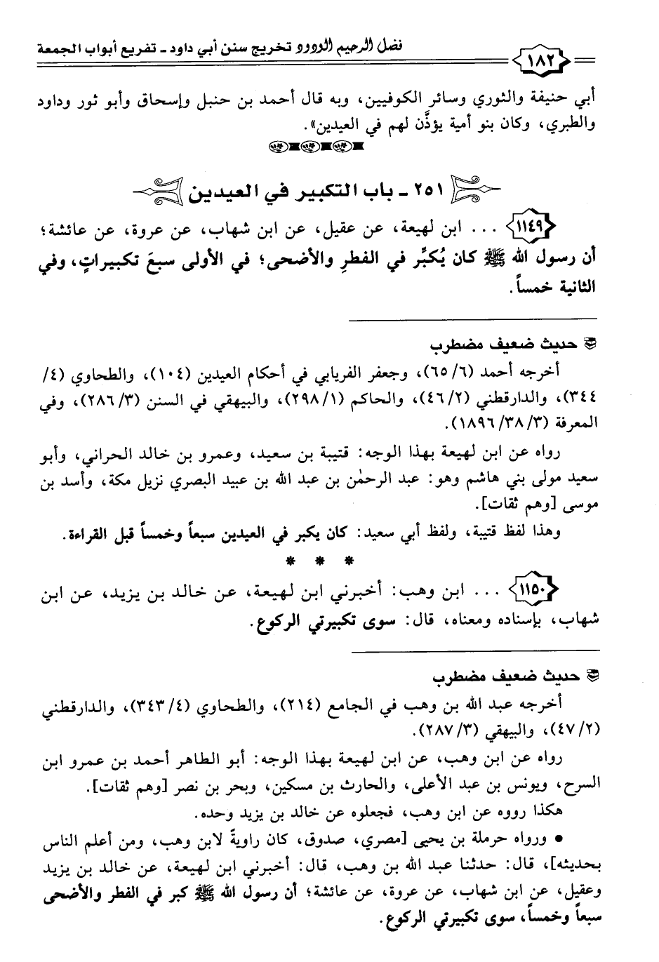 ١١٤٩ - . . . ابن لهيعة، عن عقيل، عن ابن شهاب، عن عروة، عن عائشة؛ أن رسول اللَّه -صلى اللَّه عليه وسلم- كان يُكبِّر في الفطرِ والأضحى؛ في الأولى سبعَ تكبيراتٍ، وفي الثانية خمسًا.