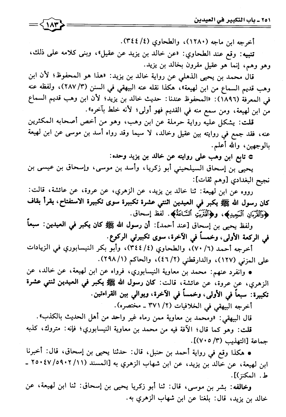 رووه عن ابن لهيعة: ثنا خالد بن يزيد، عن الزهري، عن عروة، عن عائشة، قالت: كان رسول اللَّه -صلى اللَّه عليه وسلم- يكبر في العيدين اثنتي عشرة تكبيرة سوى تكبيرة الاستفتاح، يقرأ بقاف {وَالْقُرْآنِ الْمَجِيدِ}، و {اقْتَرَبَتِ السَّاعَةُ}. لفظ إسحاق.