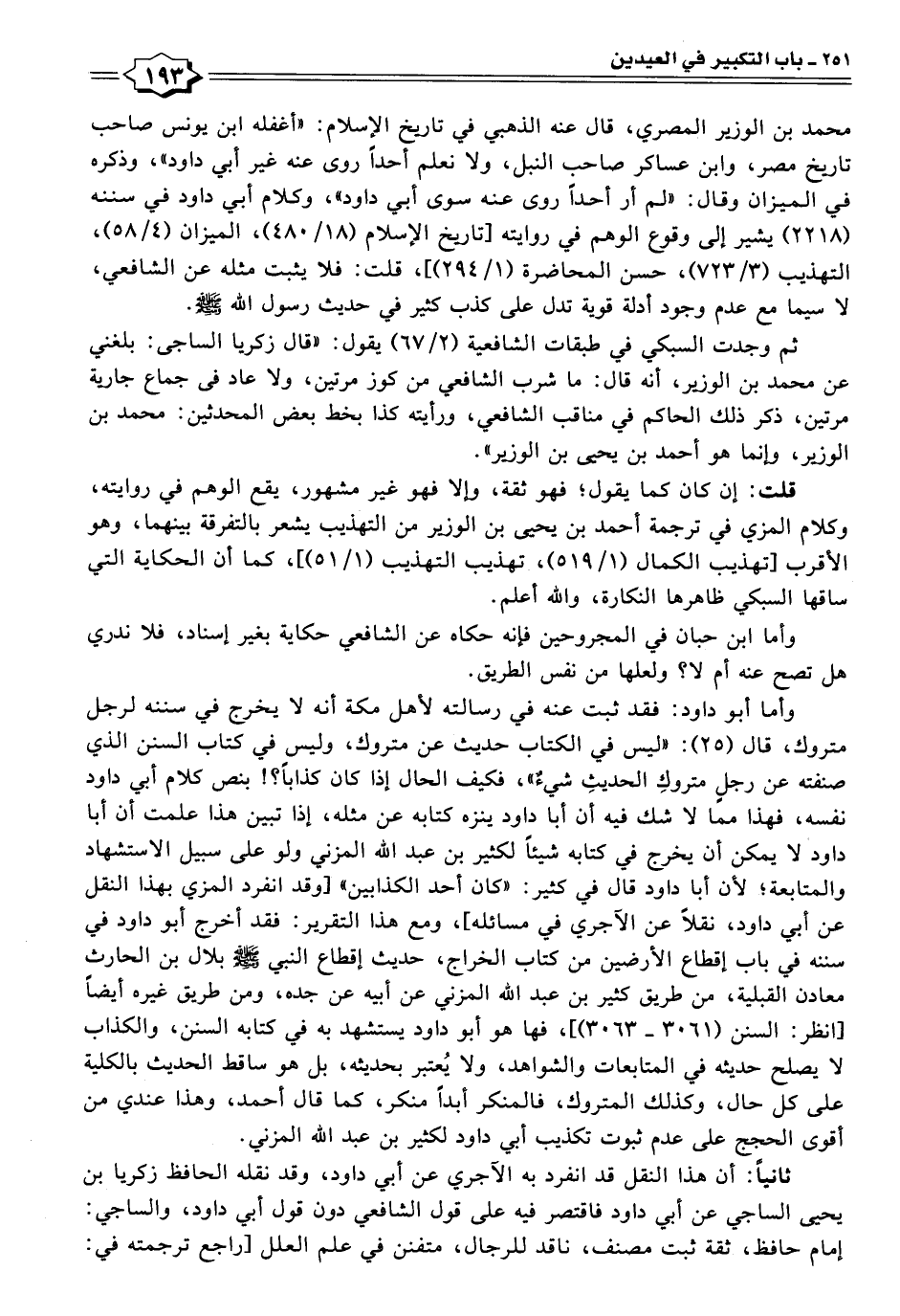 وأما أبو داود: فقد ثبت عنه في رسالته لأهل مكة أنه لا يخرج في سننه لرجل متروك، قال (٢٥): "ليس في الكتاب حديث عن متروك، وليس في كتاب السنن الذي صنفته عن رجلٍ متروكِ الحديثِ شيءٌ"، فكيف الحال إذا كان كذابًا؟! بنص كلام أبي داود نفسه، فهذا مما لا شك فيه أن أبا داود ينزه كتابه عن مثله، إذا تبين هذا علمت أن أبا داود لا يمكن أن يخرج في كتابه شيئًا لكثير بن عبد اللَّه المزني ولو على سبيل الاستشهاد والمتابعة؛ لأن أبا داود قال في كثير: "كان أحد الكذابين" [وقد انفرد المزي بهذا النقل عن أبي داود، نقلًا عن الآجري في مسائله]، ومع هذا التقرير: فقد أخرج أبو داود في سننه في باب إقطاع الأرضين من كتاب الخراج، حديث إقطاع النبي -صلى اللَّه عليه وسلم- بلال بن الحارث معادن القبلية، من طريق كثير بن عبد اللَّه المزني عن أبيه عن جده، ومن طريق غيره أيضًا [انظر: السنن (٣٠٦١ - ٣٠٦٣)]، فها هو أبو داود يستشهد به في كتابه السنن، والكذاب لا يصلح حديثه في المتابعات والشواهد، ولا يُعتبر بحديثه، بل هو ساقط الحديث بالكلية على كل حال، وكذلك المتروك، فالمنكر أبدًا منكر، كما قال أحمد، وهذا عندي من أقوى الحجج على عدم ثبوت تكذيب أبي داود لكثير بن عبد اللَّه المزني.