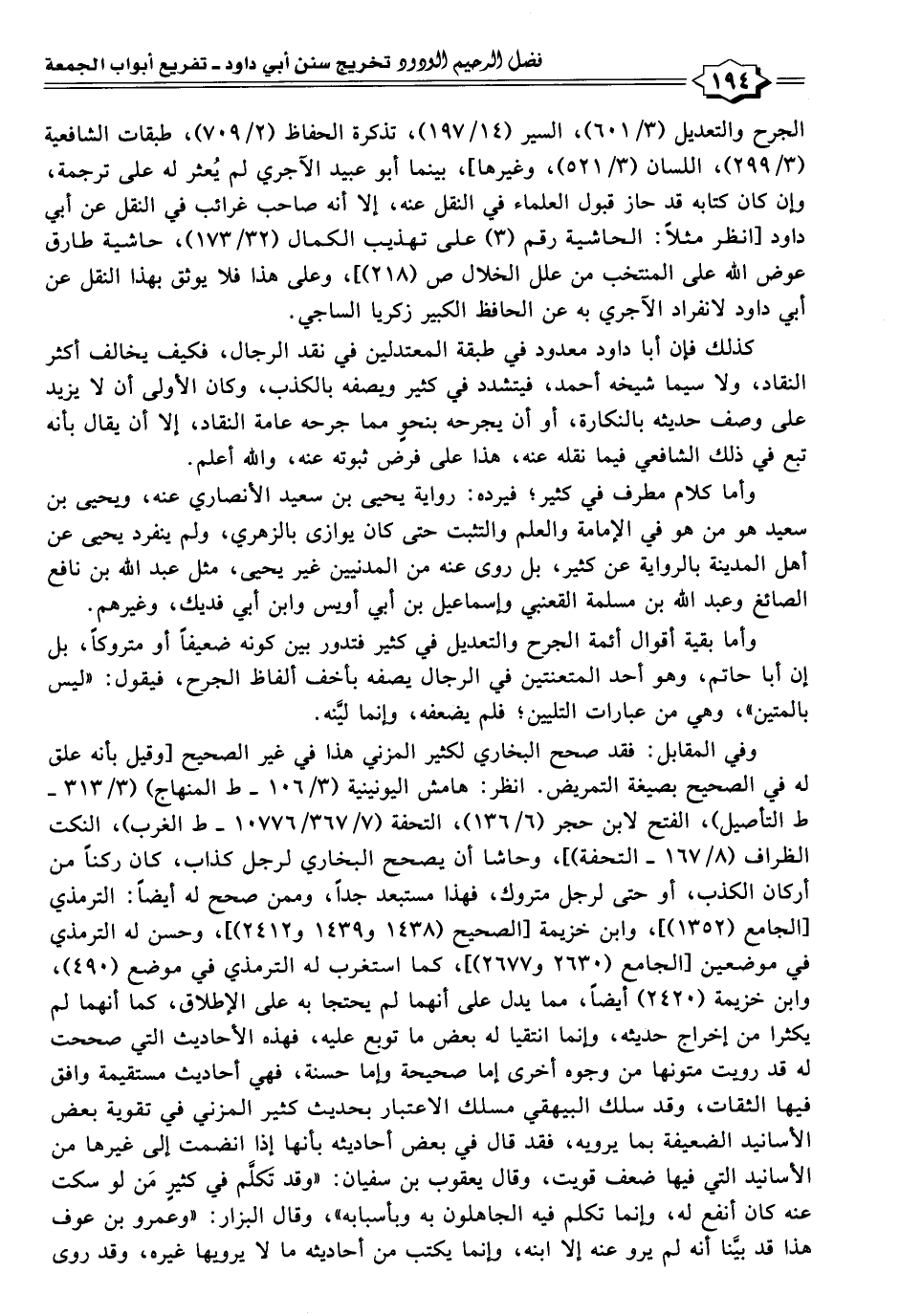 الجرح والتعديل (٣/ ٦٠١)، السير (١٤/ ١٩٧)، تذكرة الحفاظ (٢/ ٧٠٩)، طبقات الشافعية (٣/ ٢٩٩)، اللسان (٣/ ٥٢١)، وغيرها،، بينما أبو عبيد الآجري لم يُعثر له على ترجمة، وإن كان كتابه قد حاز قبول العلماء في النقل عنه، إلا أنه صاحب غرائب في النقل عن أبي داود [انظر مثلًا: الحاشية رقم (٣) على تهذيب الكمال (٣٢/ ١٧٣)، حاشية طارق عوض اللَّه على المنتخب من علل الخلال ص (٢١٨)]، وعلى هذا فلا يوثق بهذا النقل عن أبي داود لانفراد الآجري به عن الحافظ الكبير زكريا الساجي.