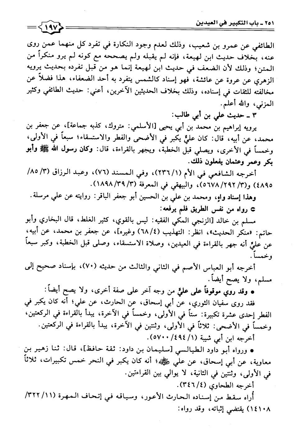 • ورواه أبو داود الطيالسي [سليمان بن داود: ثقة حافظ]، قال: ثنا زهير بن معاوية، عن أبي إسحاق، عن علي -رضي اللَّه عنه-؛ أنه كان يكبر في النحر خمس تكبيرات، ثلاثًا في الأولى، وثنتين في الثانية، لا يوالي بين القراءتين.