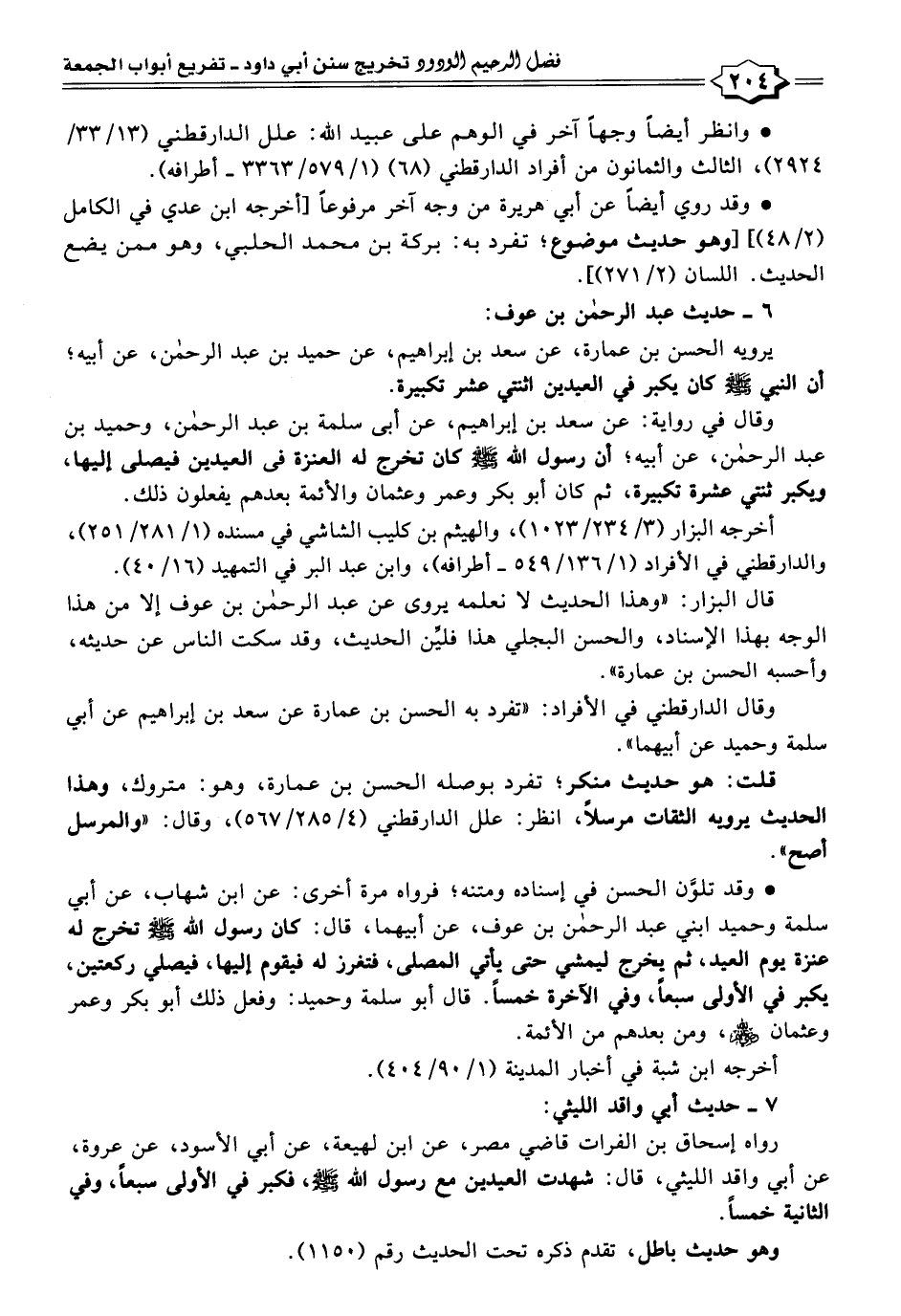 يرويه الحسن بن عمارة، عن سعد بن إبراهيم، عن حميد بن عبد الرحمن، عن أبيه؛ أن النبي -صلى اللَّه عليه وسلم- كان يكبر في العيدين اثنتي عشر تكبيرة.