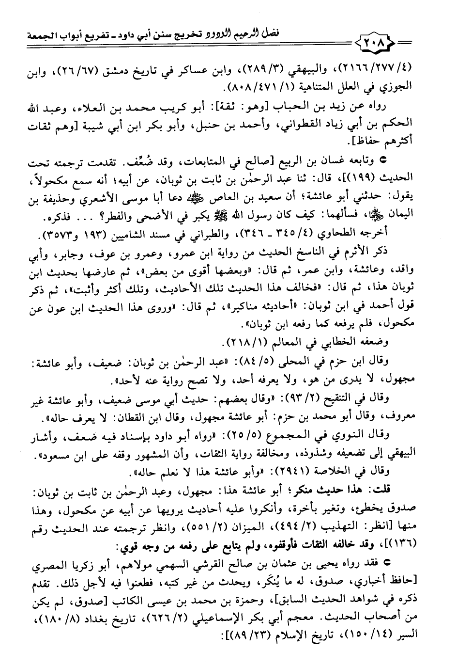 وقال ابن حزم في المحلى (٥/ ٨٤): "عبد الرحمن بن ثوبان: ضعيف، وأبو عائشة: مجهول، لا يدرى من هو، ولا يعرفه أحد، ولا تصح رواية عنه لأحد".