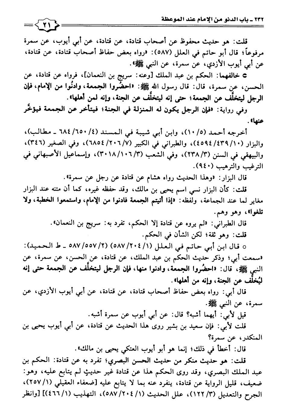 * قال ابن أبي حاتم في العلل (١/ ٢٠٤/ ٥٨٧) (٢/ ٥٥٧/ ٥٨٧ - ط الحميد): "سمعت أبي؛ وذكر حديث الحكم بن عبد الملك، عن قتادة، عن الحسن، عن سمرة، عن النبي - صلى الله عليه وسلم -، قال: "احضُروا الجمعة، وادنوا منها، فإن الرجل ليتخلَّف عن الجمعة حتى إنه ليُخلَّف عن الجنة، وإنه من أهلها".