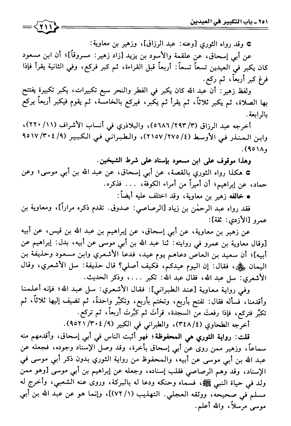 عن أبي إسحاق، عن علقمة والأسود بن يزيد [زاد زهير: مسروقًا]؛ أن ابن مسعود كان يكبر في العيدين تسعًا تسعًا: أربعًا قبل القراءة، ثم كبر فركع، وفي الثانية يقرأ فإذا فرغ كبر أربعًا، ثم ركع.