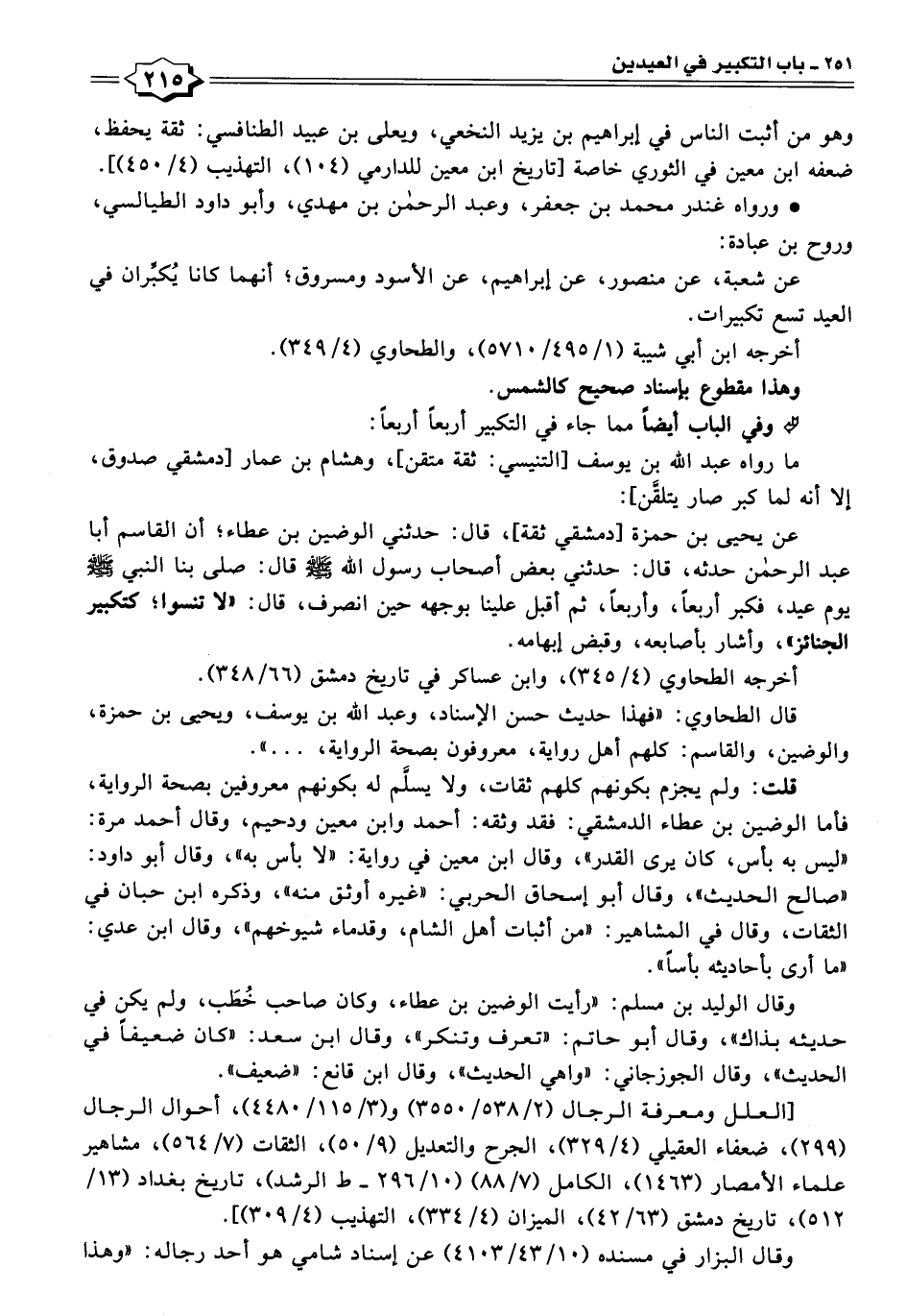 عن يحيى بن حمزة [دمشقي ثقة]، قال: حدثني الوضين بن عطاء؛ أن القاسم أبا عبد الرحمن حدثه، قال: حدثني بعض أصحاب رسول اللَّه -صلى اللَّه عليه وسلم- قال: صلى بنا النبي -صلى اللَّه عليه وسلم- يوم عيد، فكبر أربعًا، وأربعًا، ثم أقبل علينا بوجهه حين انصرف، قال: "لا تنسوا؛ كتكبير الجنائز"، وأشار بأصابعه، وقبض إبهامه.