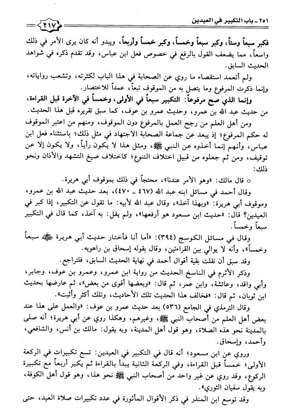 وقد توسع ابن المنذر في ذكر الأقوال المأثورة في عدد تكبيرات صلاة العيد، حتى