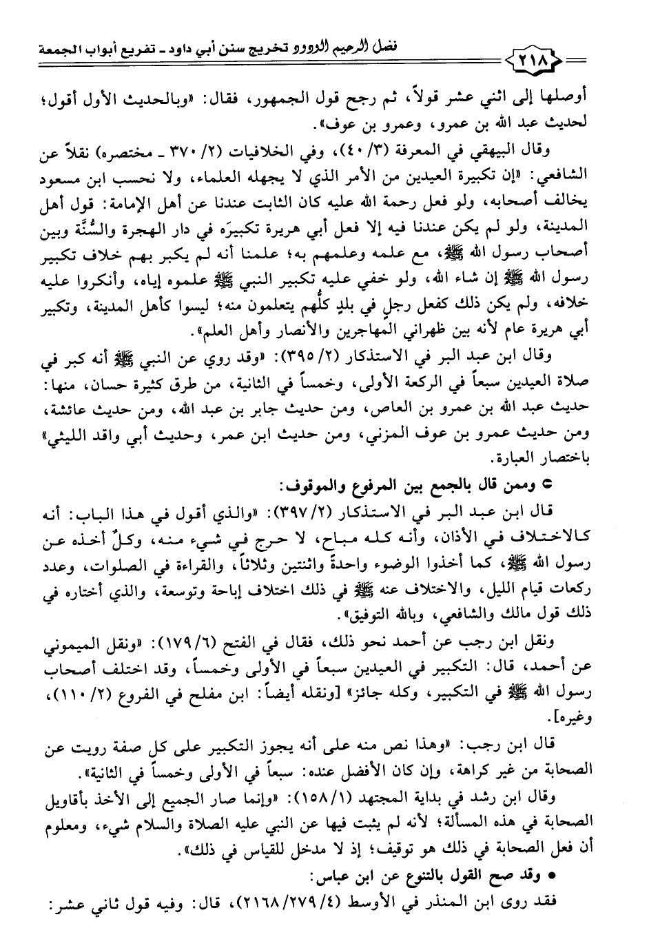 وقال ابن عبد البر في الاستذكار (٢/ ٣٩٥): "وقد روي عن النبي -صلى اللَّه عليه وسلم- أنه كبر في صلاة العيدين سبعًا في الركعة الأولى، وخمسًا في الثانية، من طرق كثيرة حسان، منها: حديث عبد اللَّه بن عمرو بن العاص، ومن حديث جابر بن عبد اللَّه، ومن حديث عائشة، ومن حديث عمرو بن عوف المزني، ومن حديث ابن عمر، وحديث أبي واقد الليثي" باختصار العبارة.