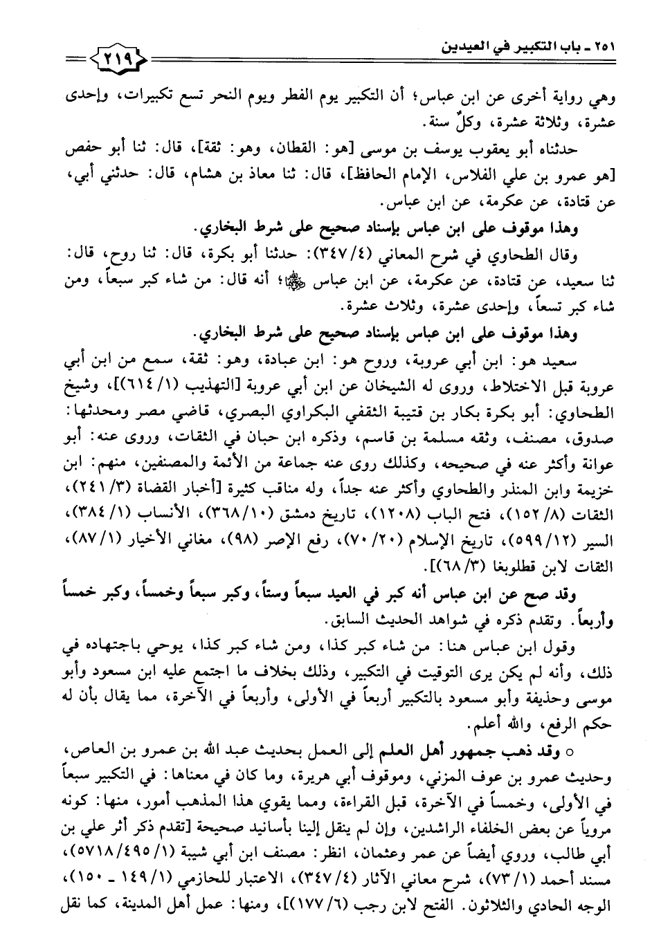 وقد صح عن ابن عباس أنه كبر في العيد سبعًا وستًا، وكبر سبعًا وخمسًا، وكبر خمسًا وأربعًا. وتقدم ذكره في شواهد الحديث السابق.