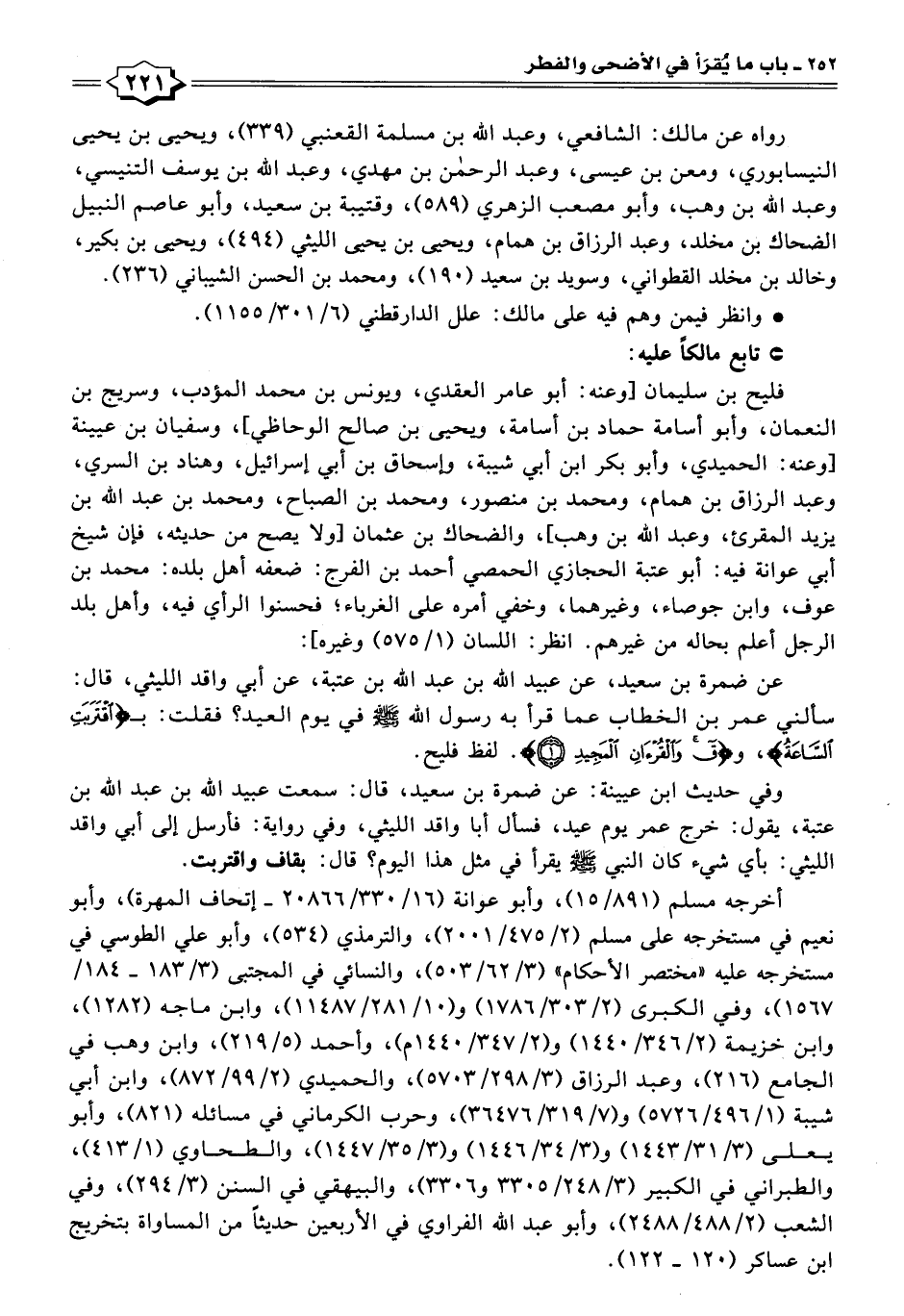 وفي حديث ابن عيينة: عن ضمرة بن سعيد، قال: سمعت عبيد اللَّه بن عبد اللَّه بن عتبة، يقول: خرج عمر يوم عيد، فسأل أبا واقد الليثي، وفي رواية: فأرسل إلى أبي واقد الليثي: بأي شيء كان النبي -صلى اللَّه عليه وسلم- يقرأ في مثل هذا اليوم؟ قال: بقاف واقتربت.
