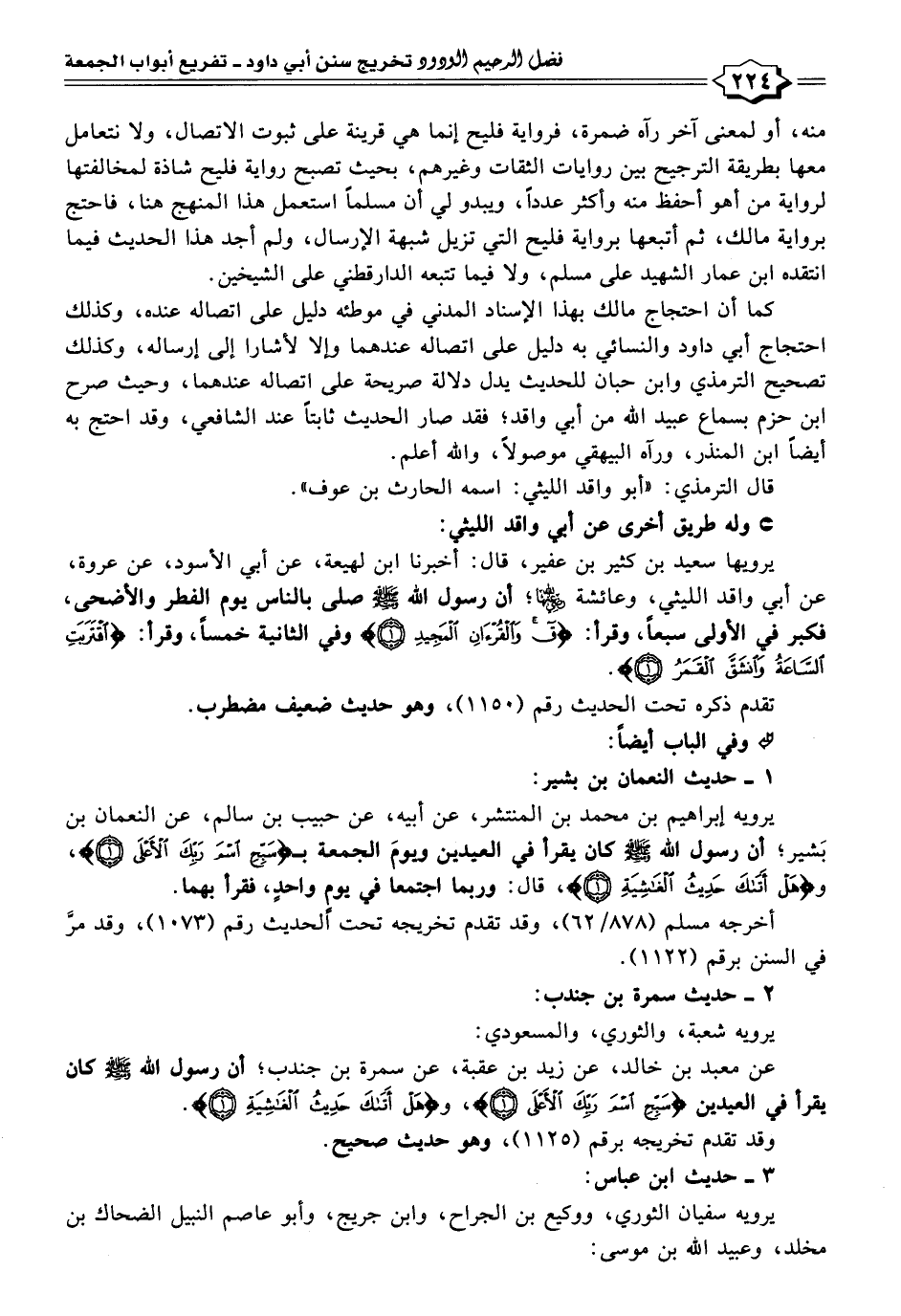 يرويه إبراهيم بن محمد بن المنتشر، عن أبيه، عن حبيب بن سالم، عن النعمان بن بَشير؛ أن رسول اللَّه -صلى اللَّه عليه وسلم- كان يقرأ في العيدين ويومَ الجمعة بـ {سَبِّحِ اسْمَ رَبِّكَ الْأَعْلَى (١)}، و {هَلْ أَتَاكَ حَدِيثُ الْغَاشِيَةِ (١)}، قال: وربما اجتمعا في يومٍ واحدٍ، فقرأ بهما.