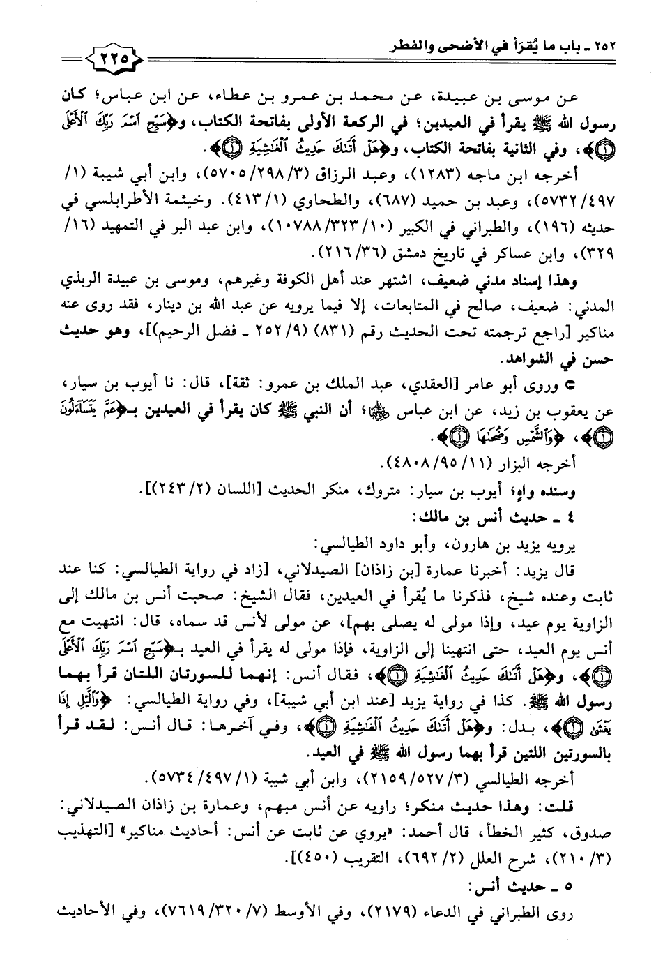 * وروى أبو عامر [العقدي، عبد الملك بن عمرو: ثقة]، قال: نا أيوب بن سيار، عن يعقوب بن زيد، عن ابن عباس -رضي اللَّه عنهما-؛ أن النبي -صلى اللَّه عليه وسلم- كان يقرأ في العيدين بـ {عَمَّ يَتَسَاءَلُونَ (١)}، {وَالشَّمْسِ وَضُحَاهَا (١)}.