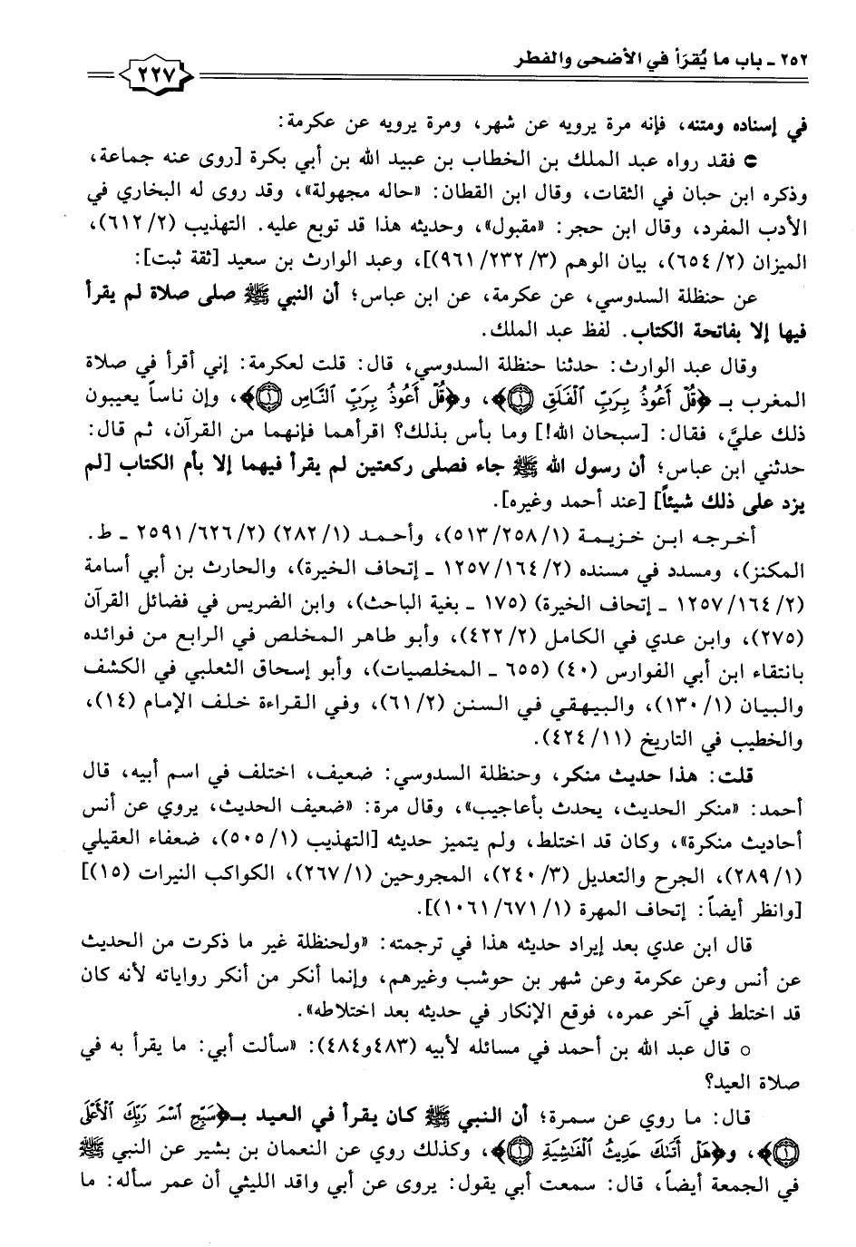 وقال عبد الوارث: حدثنا حنظلة السدوسي، قال: قلت لعكرمة: إني أقرأ في صلاة المغرب بـ {قُلْ أَعُوذُ بِرَبِّ الْفَلَقِ (١)}، و {قُلْ أَعُوذُ بِرَبِّ النَّاسِ (١)}، وإن ناسًا يعيبون ذلك عليَّ، فقال: [سبحان اللَّه!] وما بأس بذلك؟ اقرأهما فإنهما من القرآن، ثم قال: حدثني ابن عباس؛ أن رسول اللَّه -صلى اللَّه عليه وسلم- جاء فصلى ركعتين لم يقرأ فيهما إلا بأم الكتاب ألم يزد على ذلك شيئًا] [عند أحمد وغيره].