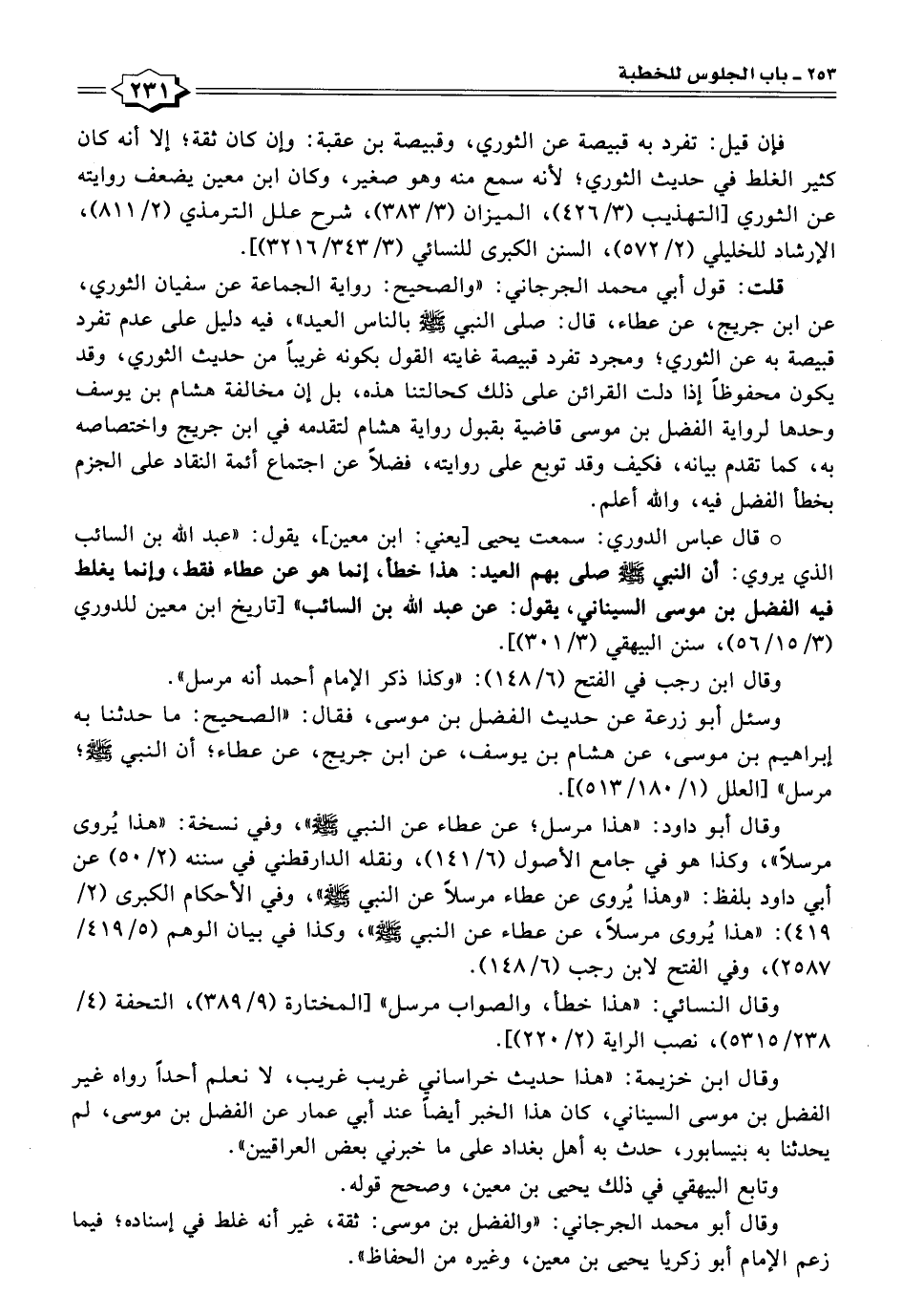 قلت: قول أبي محمد الجرجاني: "والصحيح: رواية الجماعة عن سفيان الثوري، عن ابن جريج، عن عطاء، قال: صلى النبي -صلى اللَّه عليه وسلم- بالناس العيد"، فيه دليل على عدم تفرد قبيصة به عن الثوري؛ ومجرد تفرد قبيصة غايته القول بكونه غريبًا من حديث الثوري، وقد يكون محفوظًا إذا دلت القرائن على ذلك كحالتنا هذه، بل إن مخالفة هشام بن يوسف وحدها لرواية الفضل بن موسى قاضية بقبول رواية هشام لتقدمه في ابن جريج واختصاصه به، كما تقدم بيانه، فكيف وقد توبع على روايته، فضلًا عن اجتماع أئمة النقاد على الجزم بخطأ الفضل فيه، واللَّه أعلم.