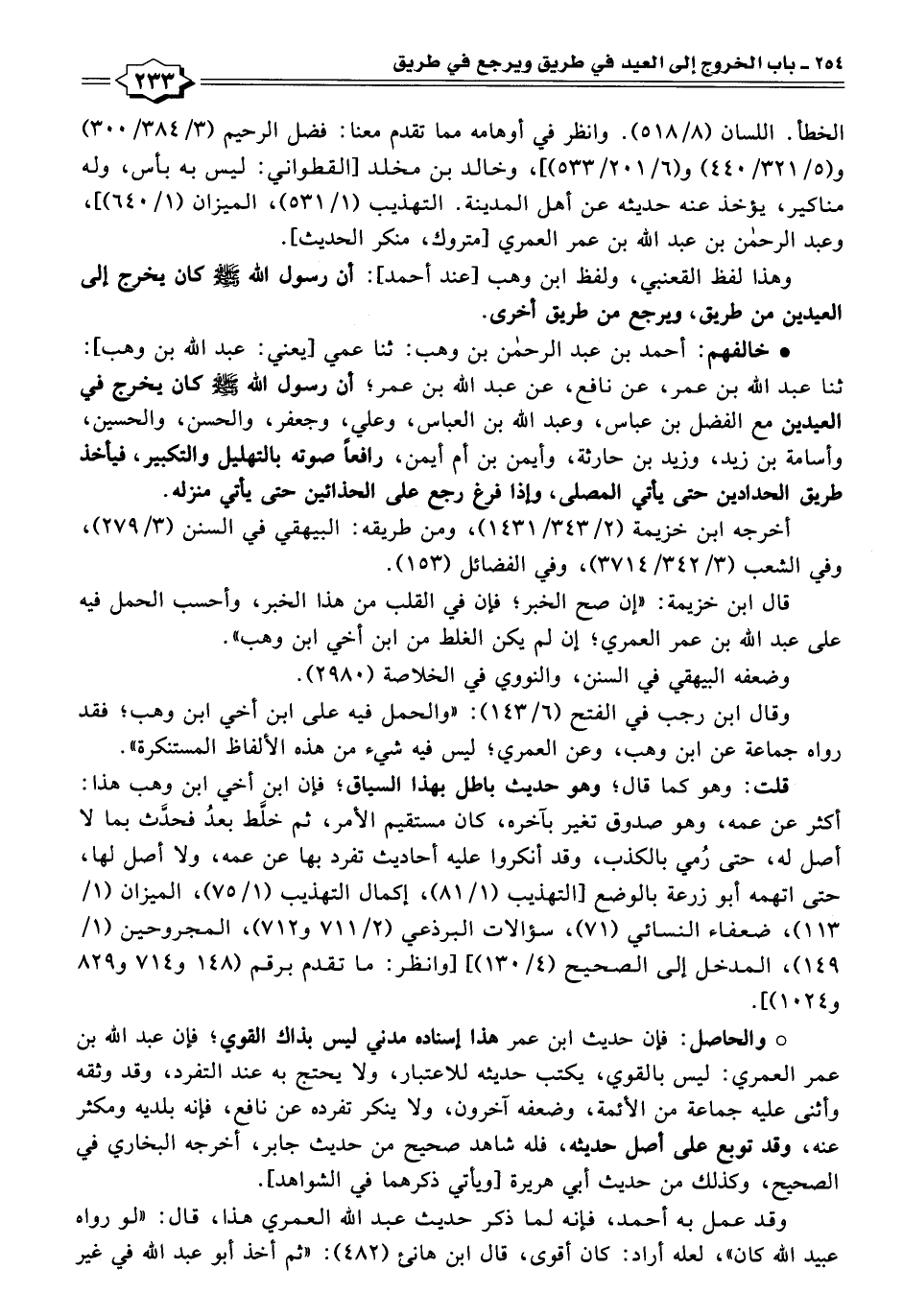 • خالفهم: أحمد بن عبد الرحمن بن وهب: ثنا عمي [يعني: عبد اللَّه بن وهب]: ثنا عبد اللَّه بن عمر، عن نافع، عن عبد اللَّه بن عمر؛ أن رسول اللَّه -صلى اللَّه عليه وسلم- كان يخرج في العيدين مع الفضل بن عباس، وعبد اللَّه بن العباس، وعلي، وجعفر، والحسن، والحسين، وأسامة بن زيد، وزيد بن حارثة، وأيمن بن أم أيمن، رافعًا صوته بالتهليل والتكبير، فيأخذ طريق الحدادين حثى يأتي المصلى، واذا فرغ رجع على الحذائين حتى يأتي منزله.
