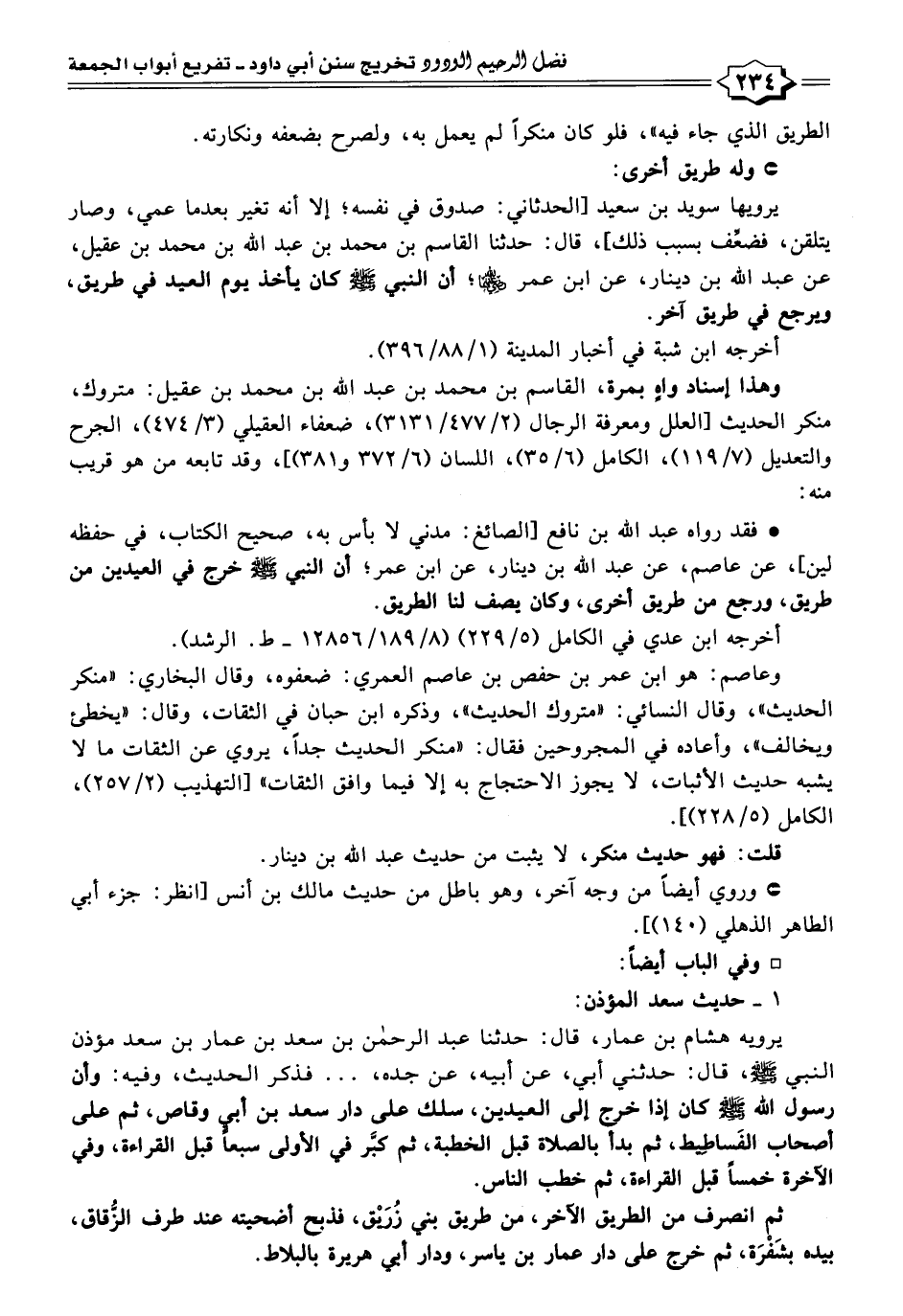 • فقد رواه عبد اللَّه بن نافع [الصائغ: مدني لا بأس به، صحيح الكتاب، في حفظه لين]، عن عاصم، عن عبد اللَّه بن دينار، عن ابن عمر؛ أن النبي -صلى اللَّه عليه وسلم- خرج في العيدين من طريق، ورجع من طريق أخرى، وكان يصف لنا الطريق.