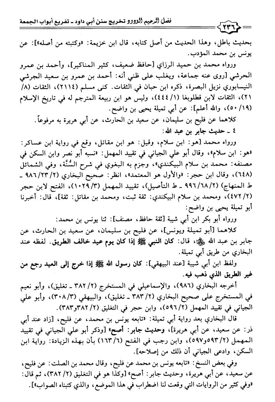 كلاهما [أبو تميلة ويونس]، عن فليح بن سليمان، عن سعيد بن الحارث، عن جابر بن عبد اللَّه -رضي اللَّه عنهما-، قال: كان النبي -صلى اللَّه عليه وسلم- إذا كان يوم عيد خالف الطريق. لفظه عند البخاري من طريق أبي تميلة.