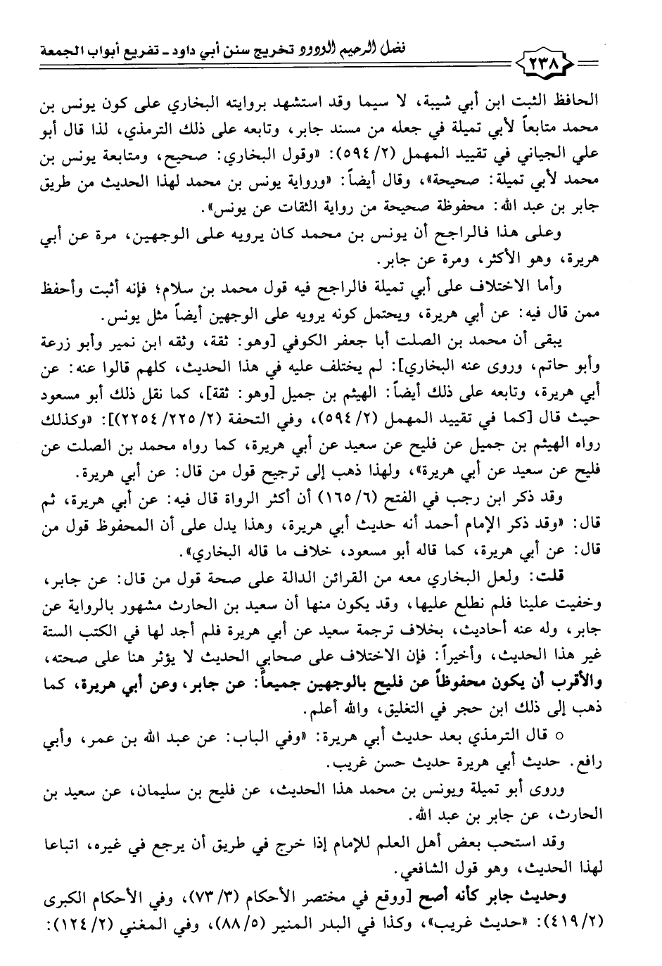 قلت: ولعل البخاري معه من القرائن الدالة على صحة قول من قال: عن جابر، وخفيت علينا فلم نطلع عليها، وقد يكون منها أن سعيد بن الحارث مشهور بالرواية عن جابر، وله عنه أحاديث، بخلاف ترجمة سعيد عن أبي هريرة فلم أجد لها في الكتب الستة غير هذا الحديث، وأخيرًا: فإن الاختلاف على صحابي الحديث لا يؤثر هنا على صحته، والأقرب أن يكون محفوظًا عن فليح بالوجهين جميعًا: عن جابر، وعن أبي هريرة، كما ذهب إلى ذلك ابن حجر في التغليق، واللَّه أعلم.