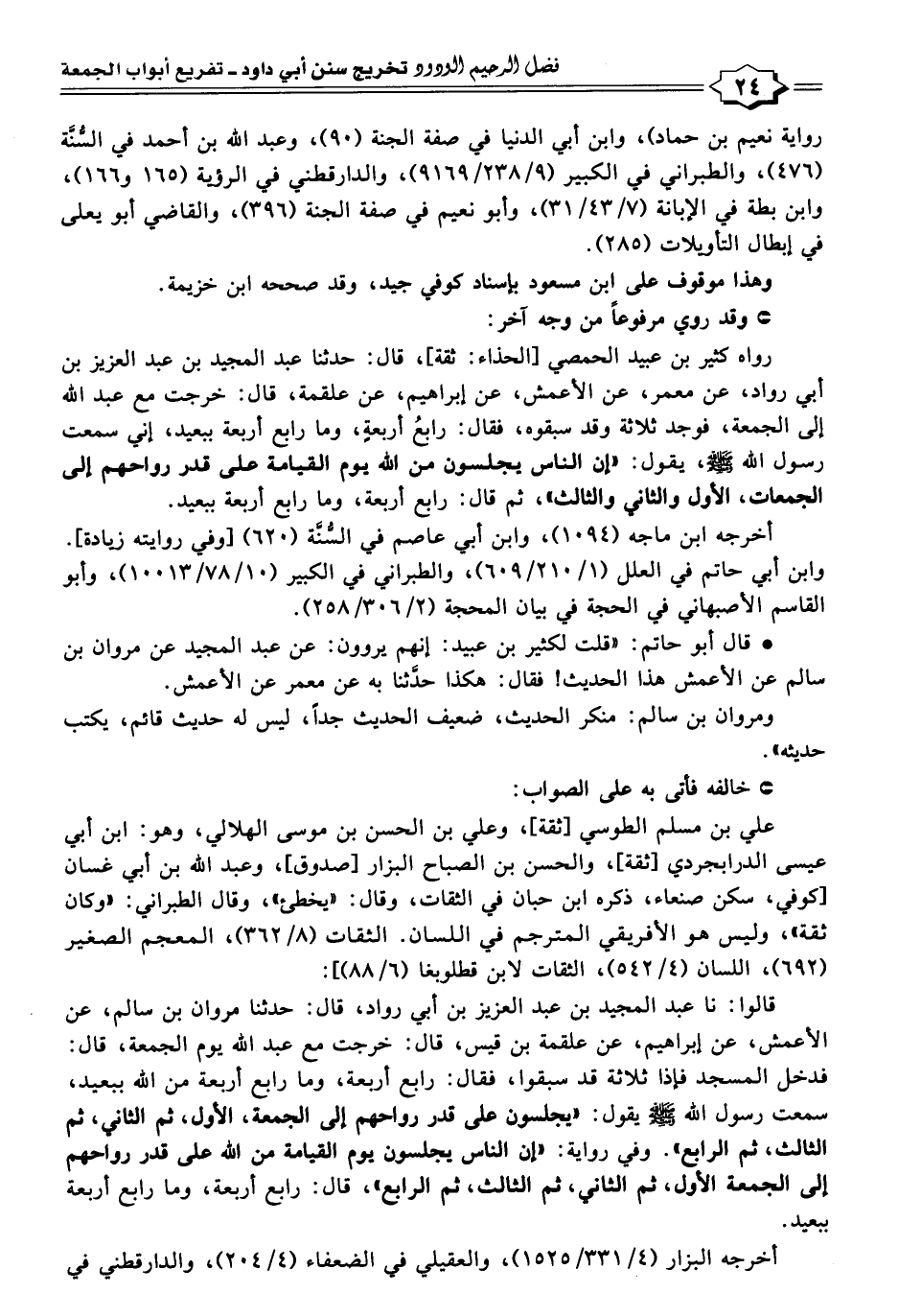 رواه كثير بن عبيد الحمصي [الحذاء: ثقة]، قال: حدثنا عبد المجيد بن عبد العزيز بن أبي رواد، عن معمر، عن الأعمش، عن إبراهيم، عن علقمة، قال: خرجت مع عبد الله إلى الجمعة، فوجد ثلاثة وقد سبقوه، فقال: رابعُ أربعةٍ، وما رابع أربعة ببعيد، إني سمعت رسول الله - صلى الله عليه وسلم -، يقول: "إن الناس يجلسون من الله يوم القيامة على قدر رواحهم إلى الجمعات، الأول والثاني والثالث"، ثم قال: رابع أربعة، وما رابع أربعة ببعيد.