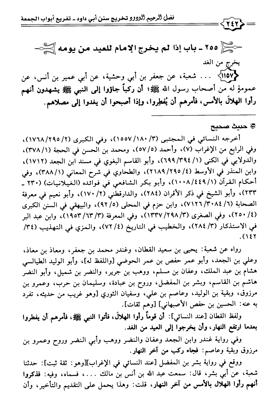 ١١٥٧ - . . . شعبة، عن جعفر بن أبي وحشية، عن أبي عمير بن أنس، عن عمومةٍ له من أصحاب رسول اللَّه -صلى اللَّه عليه وسلم-؛ أن ركبًا جاؤوا إلى النبي -صلى اللَّه عليه وسلم- يشهدون أنهم رأوا الهلالَ بالأمس، فأمرهم أن يُفطِروا، وإذا أصبحوا أن يغدوا الى مصلاهم.