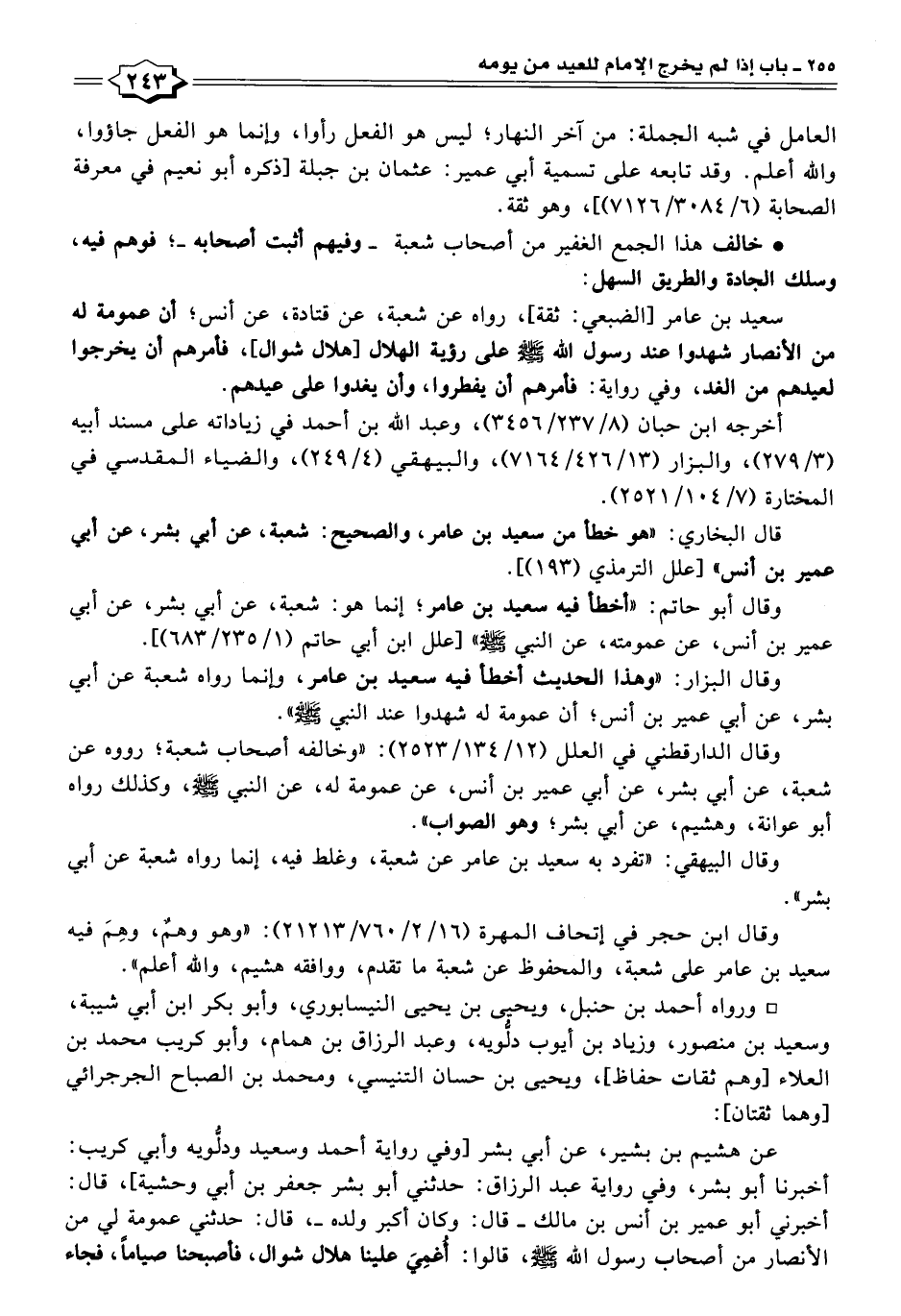 سعيد بن عامر [الضبعي: ثقة]، رواه عن شعبة، عن قتادة، عن أنس؛ أن عمومة له من الأنصار شهدوا عند رسول اللَّه -صلى اللَّه عليه وسلم- على رؤية الهلال [هلال شوال]، فأمرهم أن يخرجوا لعيدهم من الغد، وفي رواية: فأمرهم أن يفطروا، وأن يغدوا على عيدهم.