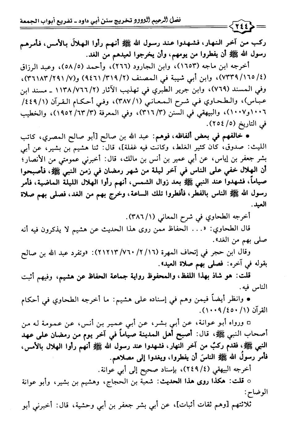 • خالفهم في بعض ألفاظه، فوهم: عبد اللَّه بن صالح [أبو صالح المصري، كاتب الليث: صدوق، كان كثير الغلط، وكانت فيه غفلة]، قال: ثنا هشيم بن بشير، عن أبي بشر جعفر بن إياس، عن أبي عمير بن أنس بن مالك، قال: أخبرني عمومتي من الأنصار؛ أن الهلال خفي على الناس في آخر ليلة من شهر رمضان في زمن النبي -صلى اللَّه عليه وسلم-، فأصبحوا صيامًا، فشهدوا عند النبي -صلى اللَّه عليه وسلم- بعد زوال الشمس، أنهم رأوا الهلال الليلة الماضية، فأمر رسول اللَّه -صلى اللَّه عليه وسلم- الناس بالفطر، فأفطروا تلك الساعة، وخرج بهم من الغد، نصلى بهم صلاة العيد.