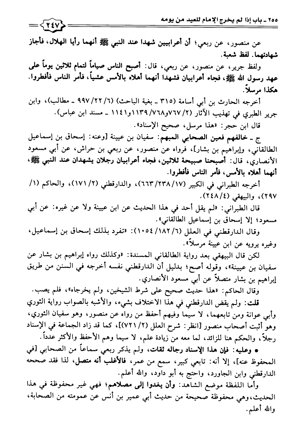 ولفظ جرير، عن منصور، عن ربعي، قال: أصبح الناس صيامًا لتمام ثلاثين يومًا على عهد رسول اللَّه -صلى اللَّه عليه وسلم-، فجاء أعرابيان فشهدا أنهما أهلاه بالأمس عشيًا، فامر الناس فأفطروا. هكذا مرسلًا.