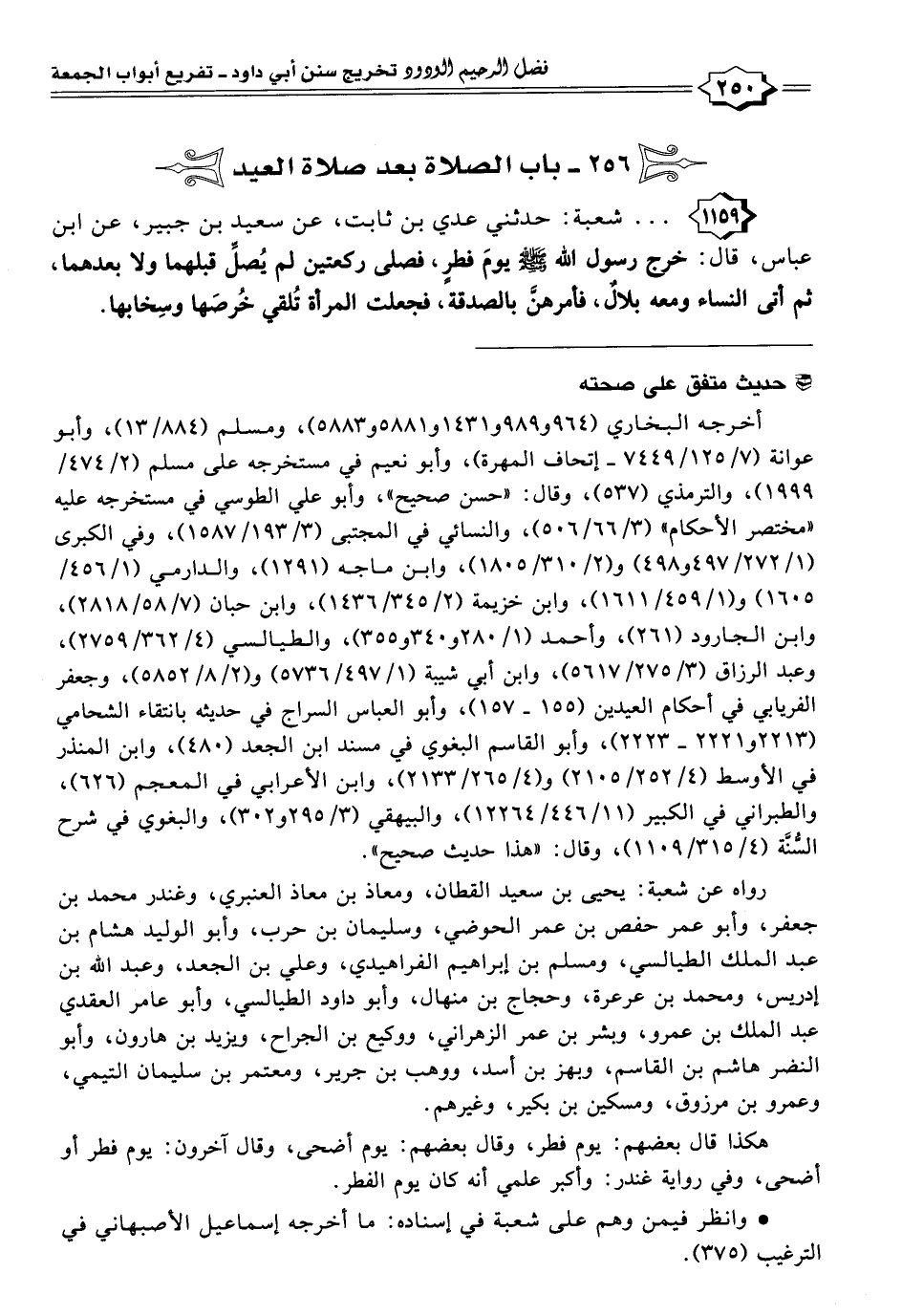 أخرجه البخاري (٩٦٤ و ٩٨٩ و ١٤٣١ و ٥٨٨١ و ٥٨٨٣)، ومسلم (٨٨٤/ ١٣)، وأبو عوانة (٧/ ١٢٥/ ٧٤٤٩ - إتحاف المهرة)، وأبو نعيم في مستخرجه على مسلم (٢/ ٤٧٤/ ١٩٩٩)، والترمذي (٥٣٧)، وقال: "حسن صحيح"، وأبو علي الطوسي في مستخرجه عليه "مختصر الأحكام" (٣/ ٦٦/ ٥٠٦)، والنسائي في المجتبى (٣/ ١٩٣/ ١٥٨٧)، وفي الكبرى (١/ ٢٧٢/ ٤٩٧ و ٤٩٨) و (٢/ ٣١٠/ ١٨٠٥)، وابن ماجه (١٢٩١)، والدارمي (١/ ٤٥٦/ ١٦٠٥) و (١/ ٤٥٩/ ١٦١١)، وابن خزيمة (٢/ ٣٤٥/ ١٤٣٦)، وابن حبان (٧/ ٥٨/ ٢٨١٨)، وابن الجارود (٢٦١)، وأحمد (١/ ٢٨٠ و ٣٤٠ و ٣٥٥)، والطيالسي (٤/ ٣٦٢/ ٢٧٥٩)، وعبد الرزاق (٣/ ٢٧٥/ ٥٦١٧)، وابن أبي شيبة (١/ ٤٩٧/ ٥٧٣٦) و (٢/ ٨/ ٥٨٥٢)، وجعفر الفريابي في أحكام العيدين (١٥٥ - ١٥٧)، وأبو العباس السراج في حديثه بانتقاء الشحامي (٢٢١٣ و ٢٢٢١ - ٢٢٢٣)، وأبو القاسم البغوي في مسند ابن الجعد (٤٨٠)، وابن المنذر في الأوسط (٤/ ٢٥٢/ ٢١٠٥) و (٤/ ٢٦٥/ ٢١٣٣)، وابن الأعرابي في المعجم (٦٢٦)، والطبراني في الكبير (١١/ ٤٤٦/ ١٢٢٦٤)، والبيهقي (٣/ ٢٩٥ و ٣٠٢)، والبغوي في شرح السُّنَّة (٤/ ٣١٥/ ١١٠٩)، وقال: "هذا حديث صحيح".