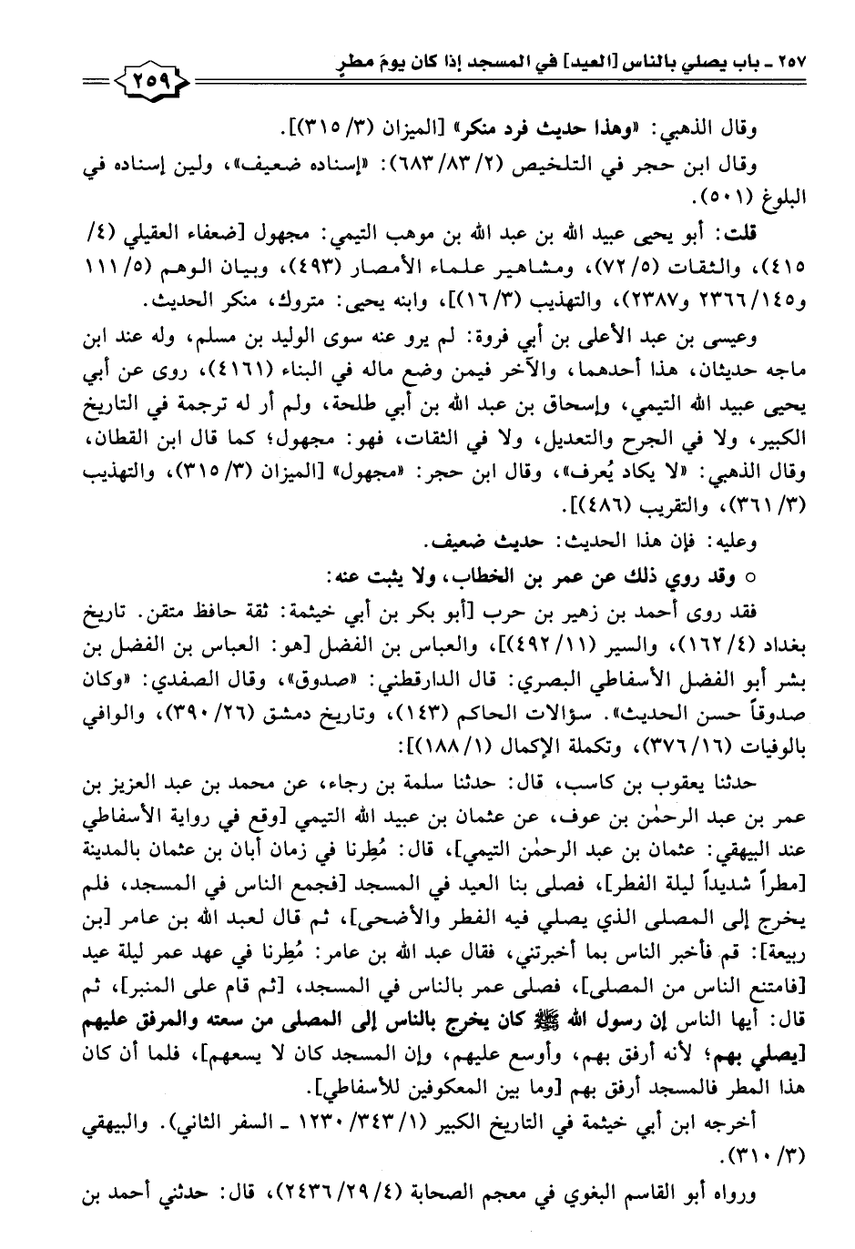 حدثنا يعقوب بن كاسب، قال: حدثنا سلمة بن رجاء، عن محمد بن عبد العزيز بن عمر بن عبد الرحمن بن عوف، عن عثمان بن عبيد اللَّه التيمي [وقع في رواية الأسفاطي عند البيهقي: عثمان بن عبد الرحمن التيمي]، قال: مُطِرنا في زمان أبان بن عثمان بالمدينة [مطرًا شديدًا ليلة الفطر]، فصلى بنا العيد في المسجد [فجمع الناس في المسجد، فلم يخرج إلى المصلى الذي يصلي فيه الفطر والأضحى]، ثم قال لعبد اللَّه بن عامر [بن ربيعة]: قم، فأخبر الناس بما أخبرتني، فقال عبد اللَّه بن عامر: مُطِرنا في عهد عمر ليلة عيد [فامتنع الناس من المصلى]، فصلى عمر بالناس في المسجد، [ثم قام على المنبر]، ثم قال: أيها الناس إن رسول اللَّه -صلى اللَّه عليه وسلم- كان يخرج بالناس إلى المصلى من سعته والمرفق عليهم [يصلي بهم؛ لأنه أرفق بهم، وأوسع عليهم، وإن المسجد كان لا يسعهم]، فلما أن كان هذا المطر فالمسجد أرفق بهم [وما بين المعكوفين للأسفاطي].