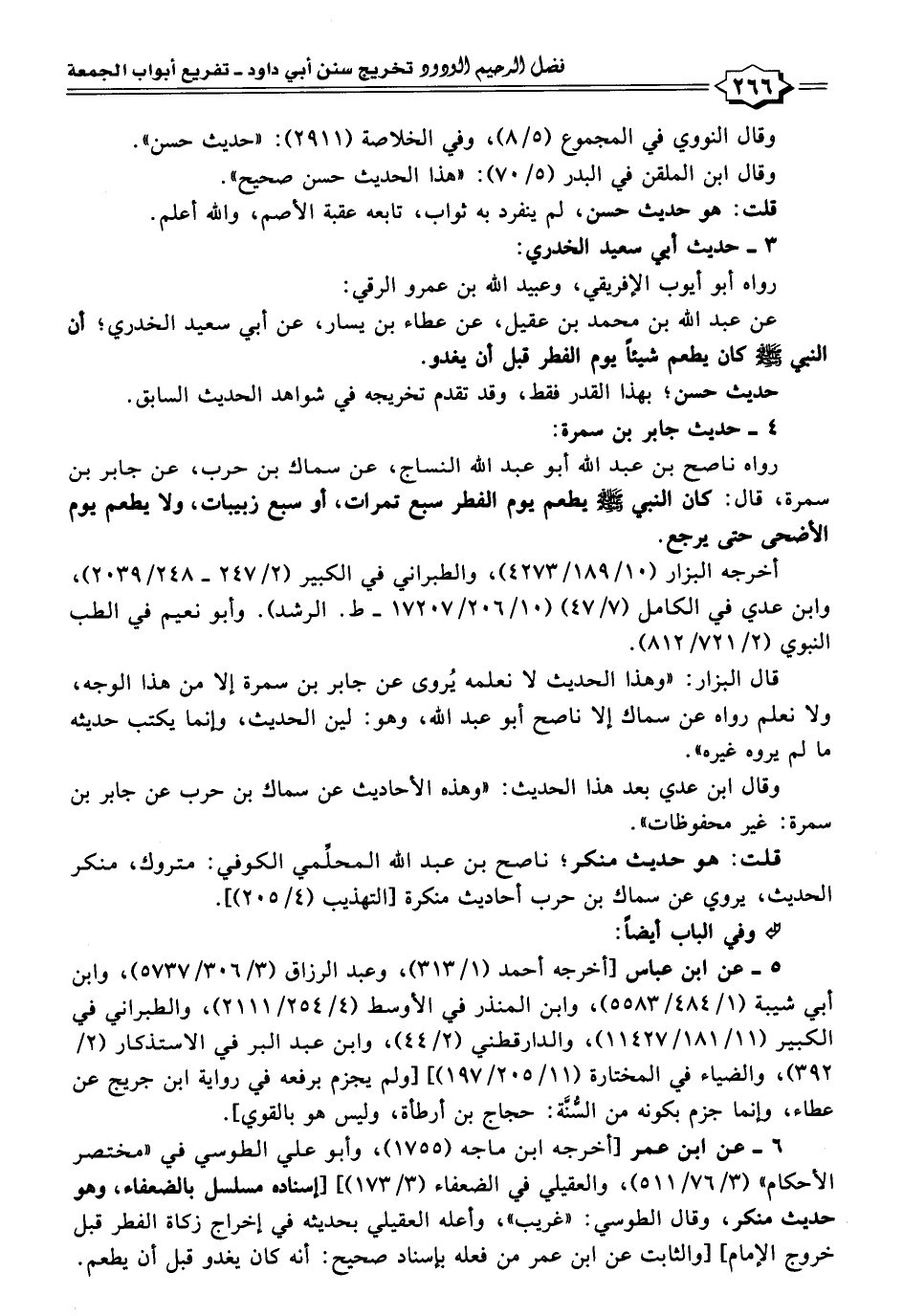 رواه ناصح بن عبد اللَّه أبو عبد اللَّه النساج، عن سماك بن حرب، عن جابر بن سمرة، قال: كان النبي -صلى اللَّه عليه وسلم- يطعم يوم الفطر سبع تمرات، أو سبع زبيبات، ولا يطعم يوم الأضحى حتى يرجع.