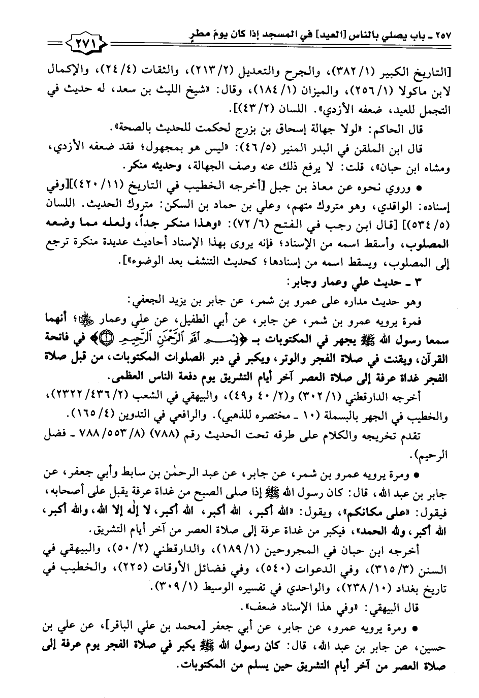 فمرة يرويه عمرو بن شمر، عن جابر، عن أبي الطفيل، عن علي وعمار -رضي اللَّه عنهما-؛ أنهما سمعا رسول اللَّه -صلى اللَّه عليه وسلم- يجهر في المكتوبات بـ {بِسْمِ اللَّهِ الرَّحْمَنِ الرَّحِيمِ} في فاتحة القرآن، ويقنت في صلاة الفجر والوتر، ويكبر في دبر الصلوات المكتوبات، من قبل صلاة الفجر غداة عرفة إلى صلاة العصر آخر أيام التشريق يوم دفعة الناس العظمى.