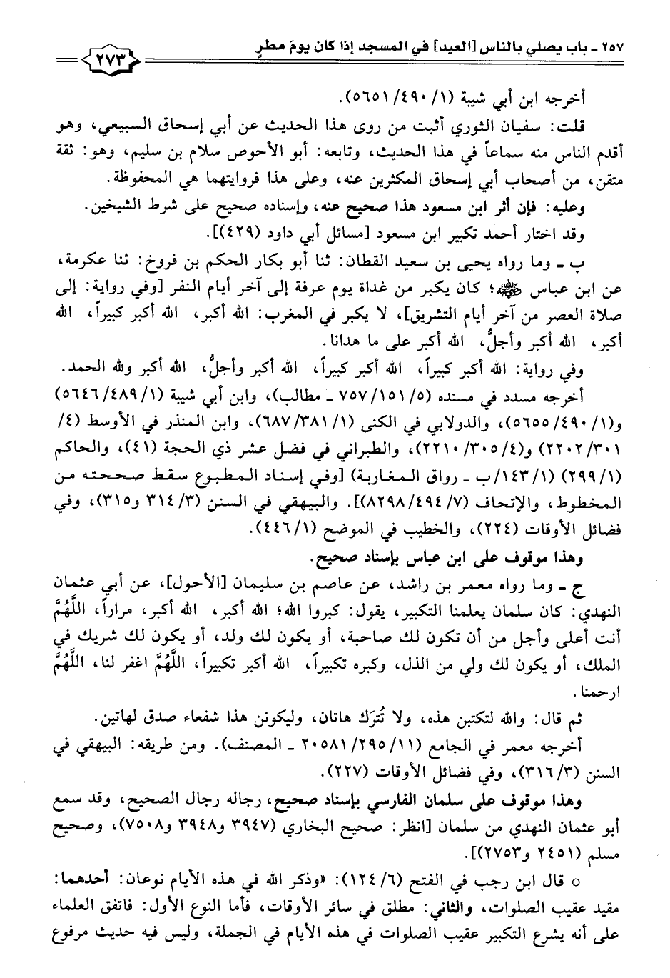 ب- وما رواه يحيى بن سعيد القطان: ثنا أبو بكار الحكم بن فروخ: ثنا عكرمة، عن ابن عباس -رضي اللَّه عنه-؛ كان يكبر من غداة يوم عرفة إلى آخر أيام النفر [وفي رواية: إلى صلاة العصر من آخر أيام التشريق]، لا يكبر في المغرب: اللَّه أكبر، اللَّه أكبر كبيرًا، اللَّه أكبر، اللَّه أكبر وأجلُّ، اللَّه أكبر على ما هدانا.
