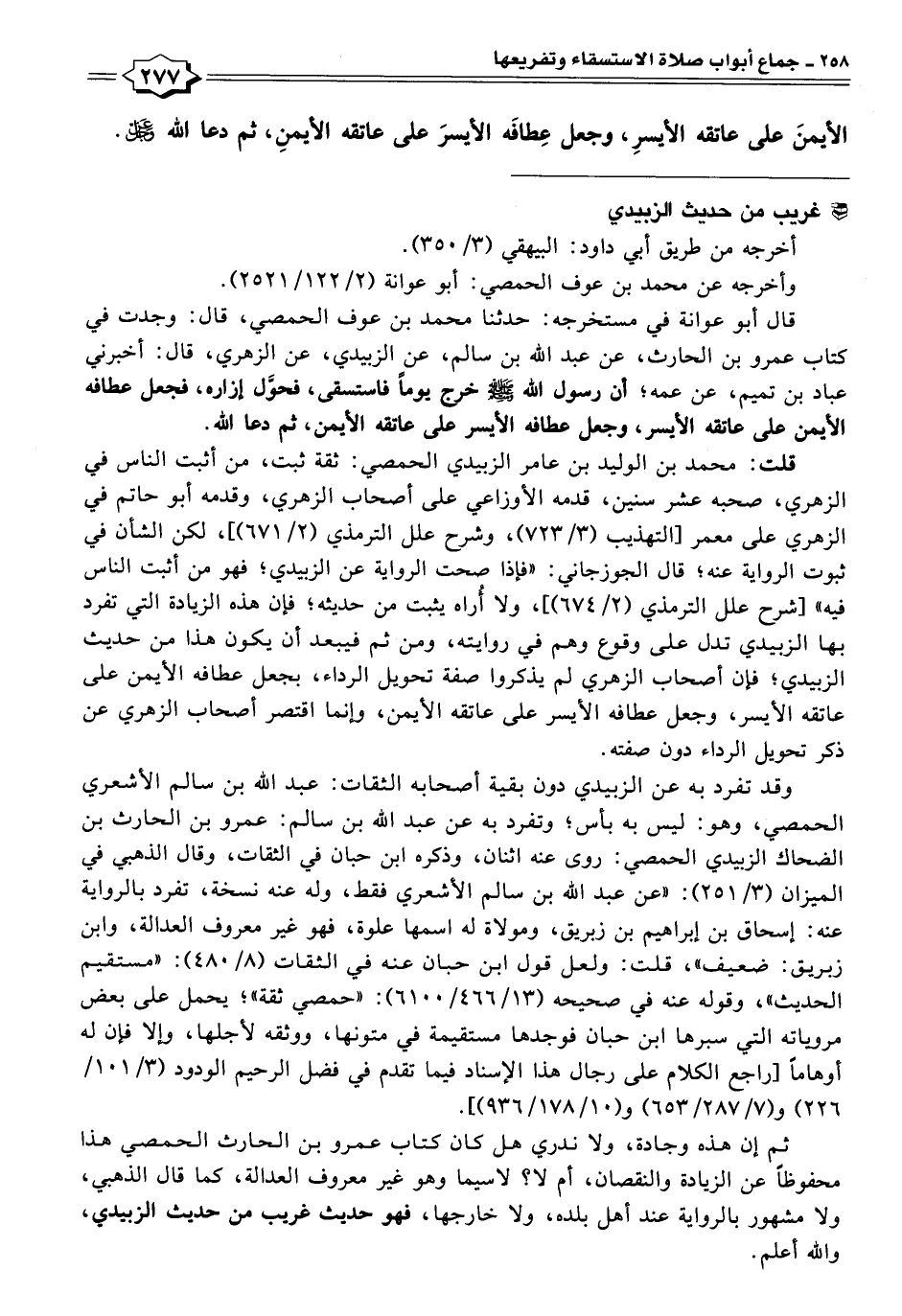 قلت: محمد بن الوليد بن عامر الزبيدي الحمصي: ثقة ثبت، من أثبت الناس في الزهري، صحبه عشر سنين، قدمه الأوزاعي على أصحاب الزهري، وقدمه أبو حاتم في الزهري على معمر [التهذيب (٣/ ٧٢٣)، وشرح علل الترمذي (٢/ ٦٧١)]، لكن الشأن في ثبوت الرواية عنه؛ قال الجوزجاني: "فإذا صحت الرواية عن الزبيدي؛ فهو من أثبت الناس فيه" [شرح علل الترمذي (٢/ ٦٧٤)]، ولا أُراه يثبت من حديثه؛ فإن هذه الزيادة التي تفرد بها الزبيدي تدل على وقوع وهم في روايته، ومن ثم فيبعد أن يكون هذا من حديث الزبيدي؛ فغن أصحاب الزهري لم يذكروا صفة تحويل الرداء، بجعل عطافه الأيمن على عاتقه الأيسر، وجعل عطافه الأيسر على عاتقه الأيمن، وإنما اقتصر أصحاب الزهري عن ذكر تحويل الرداء دون صفته.