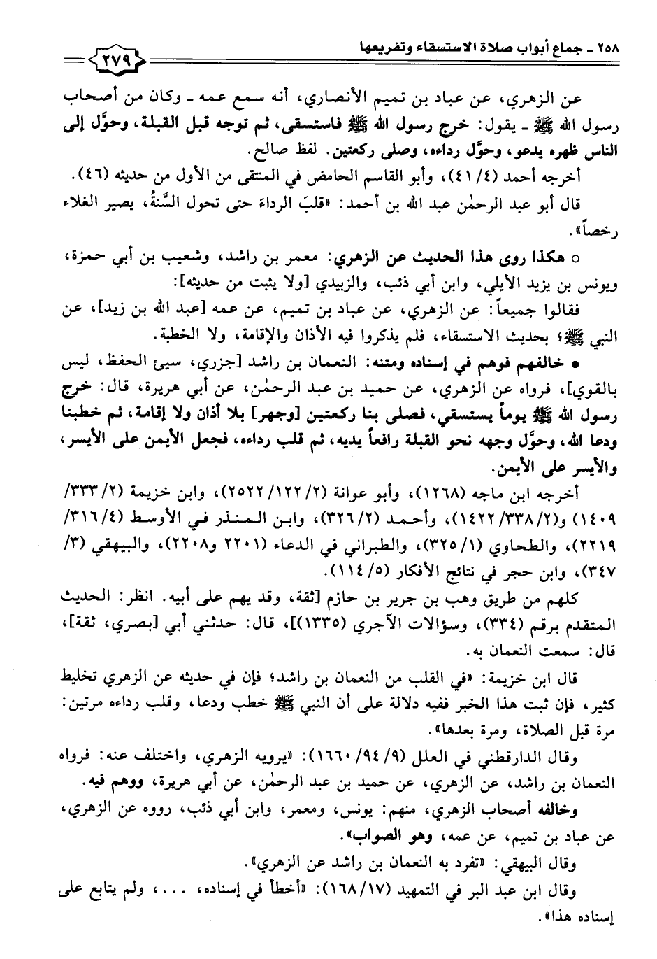 قال ابن خزيمة: "في القلب من النعمان بن راشد؛ فإن في حديثه عن الزهري تخليط كثير، فإن ثبت هذا الخبر ففيه دلالة على أن النبي -صلى اللَّه عليه وسلم- خطب ودعا، وقلب رداءه مرتين: مرة قبل الصلاة، ومرة بعدها".