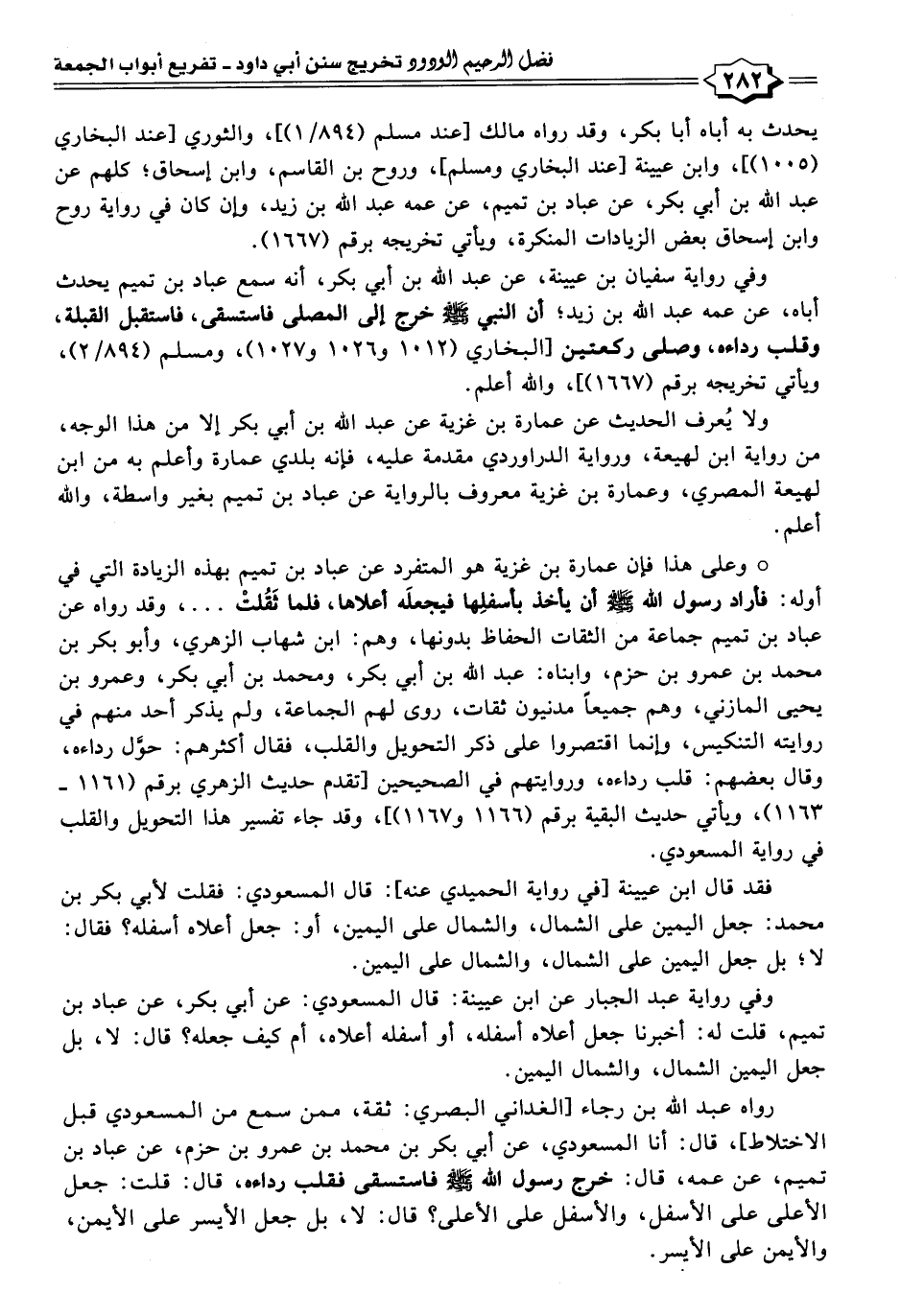 ° وعلى هذا فإن عمارة بن غزية هو المتفرد عن عباد بن تميم بهذه الزيادة التي في أوله: فأراد رسول اللَّه -صلى اللَّه عليه وسلم- أن يأخد بأسفلِها فيجعلَه أعلاها، فلما ثَقُلتْ. . .، وقد رواه عن عباد بن تميم جماعة من الثقات الحفاظ بدونها، وهم: ابن شهاب الزهري، وأبو بكر بن محمد بن عمرو بن حزم، وابناه: عبد اللَّه بن أبي بكر، ومحمد بن أبي بكر، وعمرو بن يحيى المازني، وهم جميعًا مدنيون ثقات، روى لهم الجماعة، ولم يذكر أحد منهم في روايته التنكيس، وإنما اقتصروا على ذكر التحويل والقلب، فقال أكثرهم: حوَّل رداءه، وقال بعضهم: قلب رداءه، وروايتهم في الصحيحين [تقدم حديث الزهري برقم (١١٦١ - ١١٦٣)، ويأتي حديث البقية برقم (١١٦٦ و ١١٦٧)]، وقد جاء تفسير هذا التحويل والقلب في رواية المسعودي.