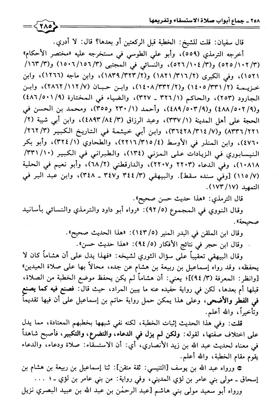 وقال البيهقي تعقيبًا على سؤال الثوري لشيخه: "فهذا يدل على أن هشامًا كان لا يحفظه، وقد رواه إسماعيل بن ربيعة بن هشام عن جده، محالًا بها على صلاة العيدين" [وانظر: المعرفة (٣/ ٩٤)]؛ يعني: أن هشامًا لم يكن يحفظ موضع الخطبة من الصلاة، قبلها أم بعدها، لكن في رواية حفيده عنه ما يبين المراد، حيث قال: فصنع فيه كما يصنع في الفطر والأضحى، وعلى هذا يمكن حمل رواية حاتم بن إسماعيل على أن فيها تقديمًا وتأخيرًا، واللَّه أعلم.
