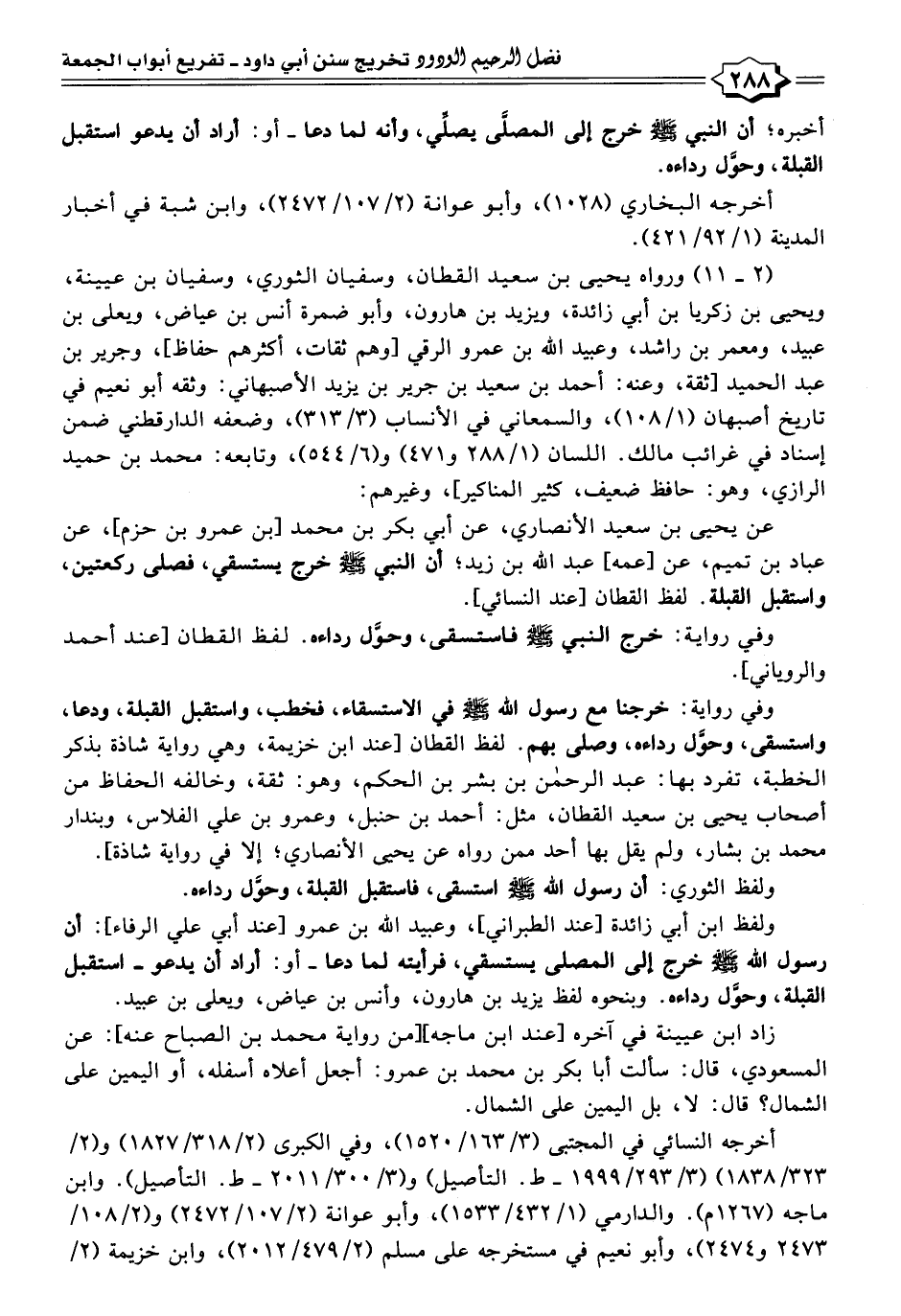 ولفظ ابن أبي زائدة [عند الطبراني]، وعبيد اللَّه بن عمرو [عند أبي علي الرفاء]: أن رسول اللَّه -صلى اللَّه عليه وسلم- خرج إلى المصلى يستسقي، فرأيته لما دعا -أو: أراد أن يدعو- استقبل القبلة، وحَّول رداءه. وبنحوه لفظ يزيد بن هارون، وأنس بن عياض، ويعلى بن عبيد.
