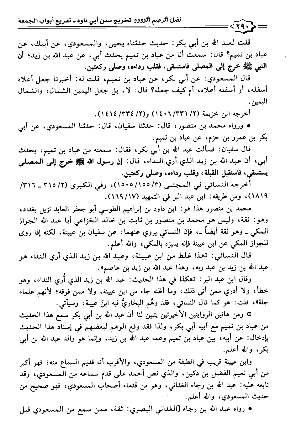 قال سفيان: فسألت عبد اللَّه بن أبي بكر، فقال: سمعته من عباد بن تميم، يحدث أبي، أن عبد اللَّه بن زيد الذي أري النداء، قال: إن رسول اللَّه -صلى اللَّه عليه وسلم- خرج الى المصلى يستسقي، فاستقبل القبلة، وقلب رداءه، وصلى ركعتين.