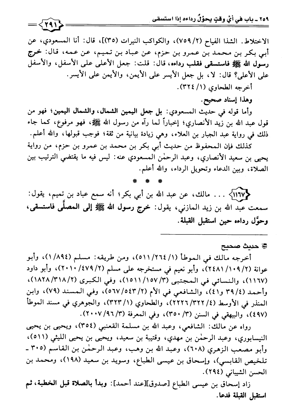 كذلك فإن المحفوظ من حديث أبي بكر بن محمد بن عمرو بن حزم، من رواية يحيى بن سعيد الأنصاري، وعبد الرحمن المسعودي عنه: ليس فيه ما يقتضي الترتيب بين الصلاة، وبين الدعاء وتحويل الرداء، واللَّه أعلم.