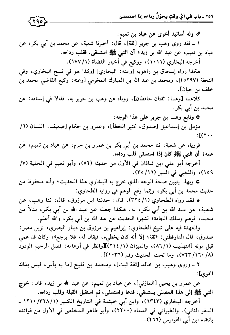 ١ - فقد روى وهب بن جرير [ثقة]، قال: أخبرنا شعبة، عن محمد بن أبي بكر، عن عباد بن تميم، عن عبد اللَّه بن زيد؛ أن النبي -صلى اللَّه عليه وسلم- استسقى، فقلب رداءه.
