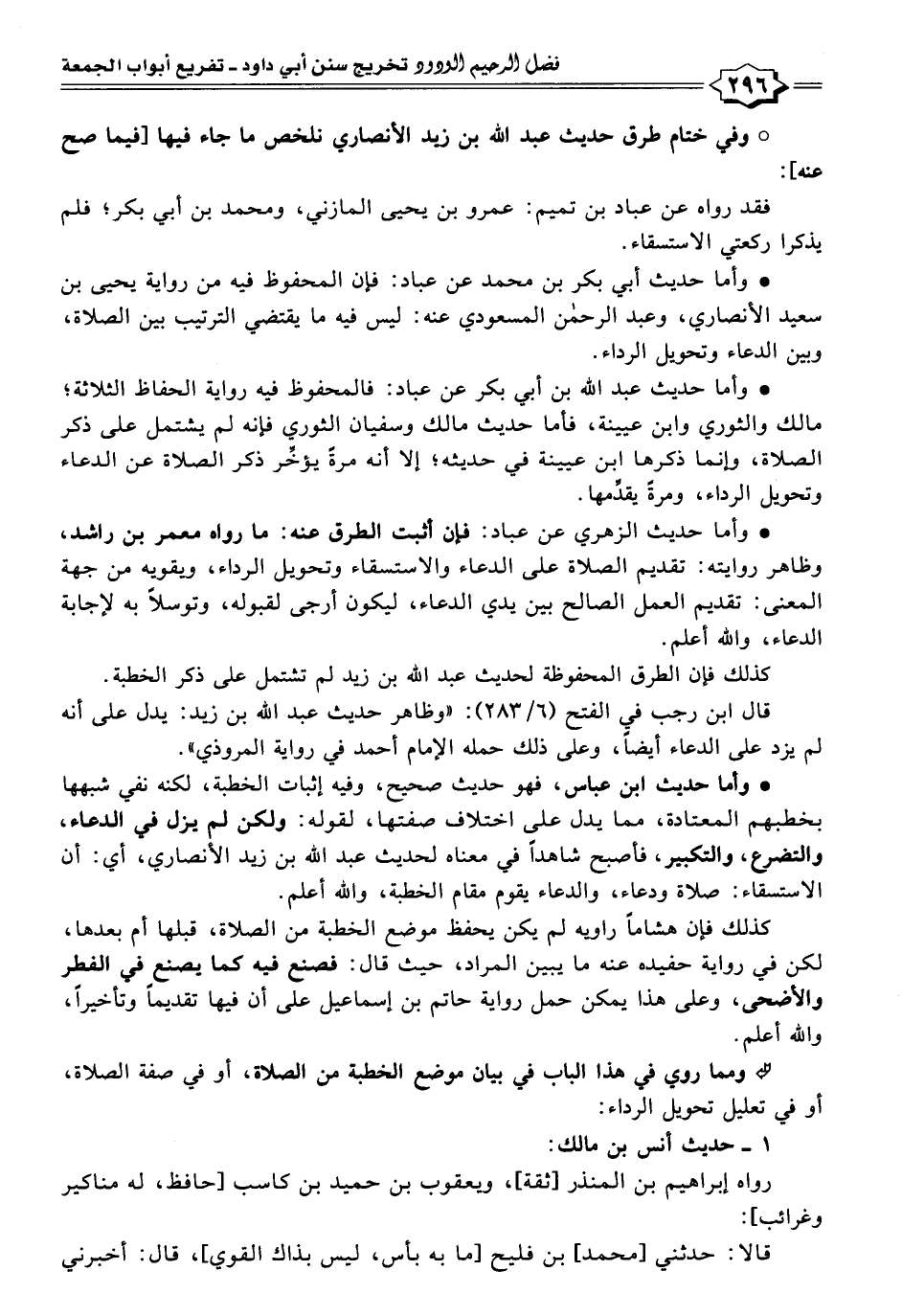 • وأما حديث أبي بكر بن محمد عن عباد: فإن المحفوظ فيه من رواية يحيى بن سعيد الأنصاري، وعبد الرحمن المسعودي عنه: ليس فيه ما يقتضى الترتيب بين الصلاة، وبين الدعاء وتحويل الرداء.